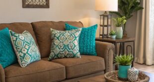 This office blends earthy clay hues with romantic floral touches for a sophisticated yet cozy feel. Textured white brick walls complement vintage floral artwork, while a plush upholstered chair with ruffled pillows adds comfort. Floral branches soften the space, creating a refined yet inviting environment.