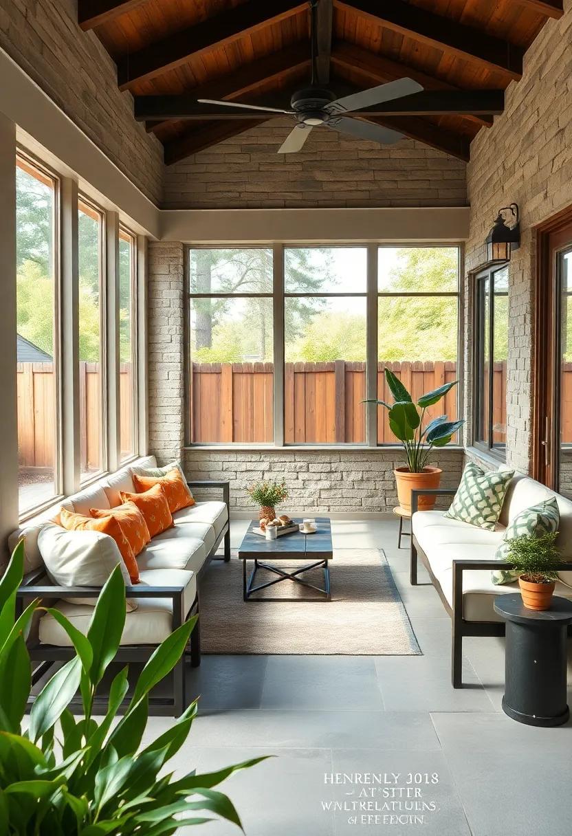 Transform your screened porch into a captivating retreat by creating a sunken seating area with stones or bricks. This design element not only provides a unique aesthetic but also offers a sense of intimacy that encourages relaxing conversations.Consider using natural stones to blend harmoniously with your outdoor surroundings, or choose vibrant bricks to make a bold statement. With a slight dip in the ground, you can add plush cushions and warm blankets, turning this nook into a cozy haven perfect for unwinding at the end of the day.