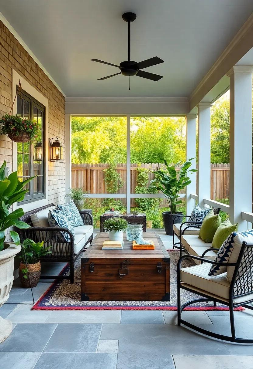 Embrace a sense of nostalgia and charm by incorporating a vintage trunk as a low table on your screened porch. This unique piece not only serves as a functional tabletop but also offers an intriguing focal point that can tell a story. Dress the trunk with a soft, textured throw or layer it with a collection of well-loved books and a few decorative items to enhance its appeal. Its rustic character can be accentuated by placing it among eclectic seating options such as:
