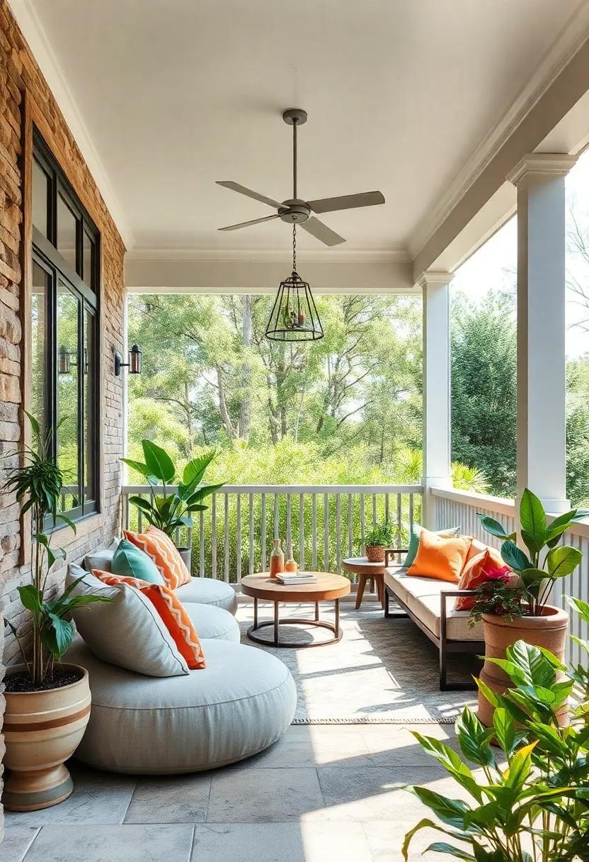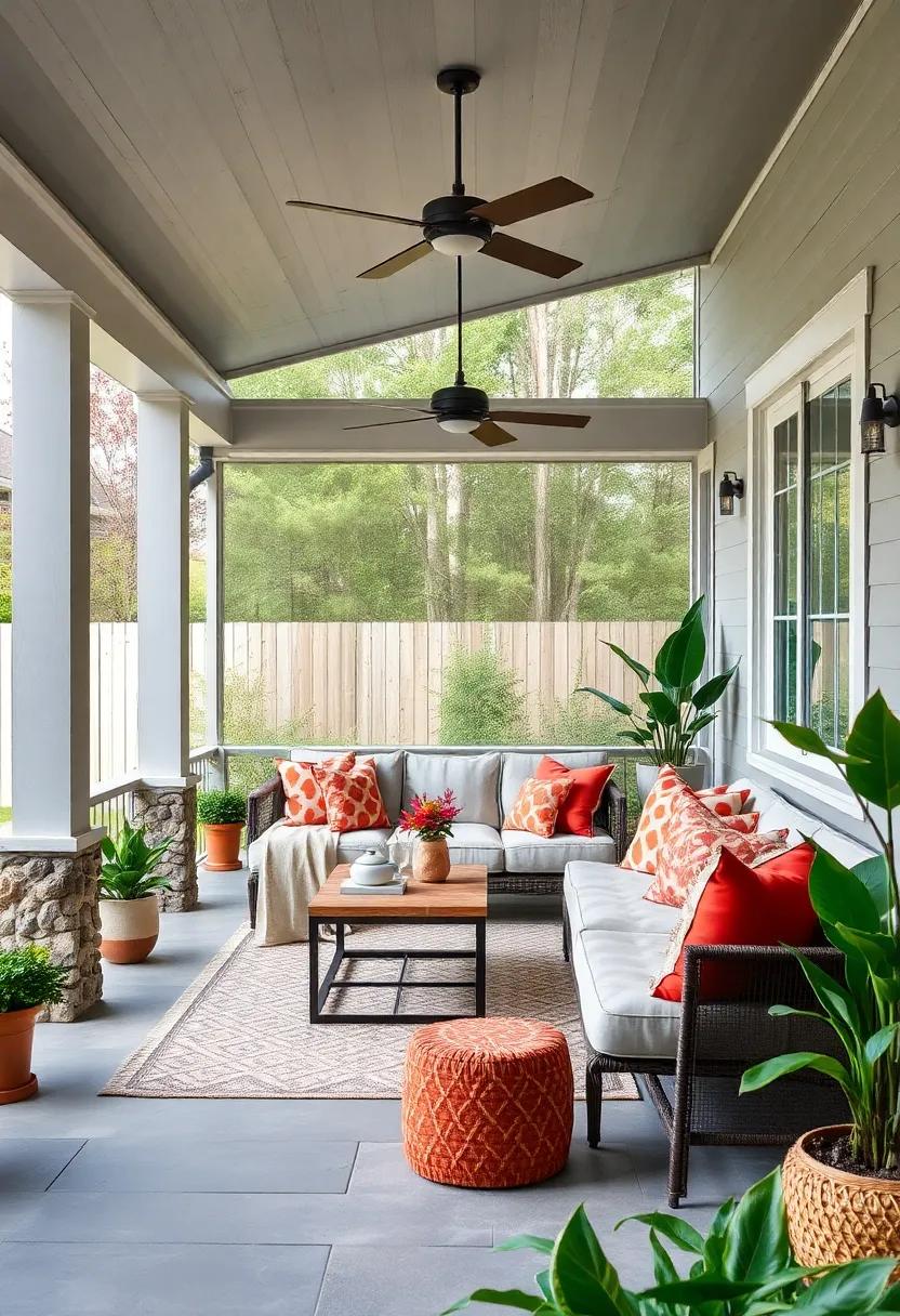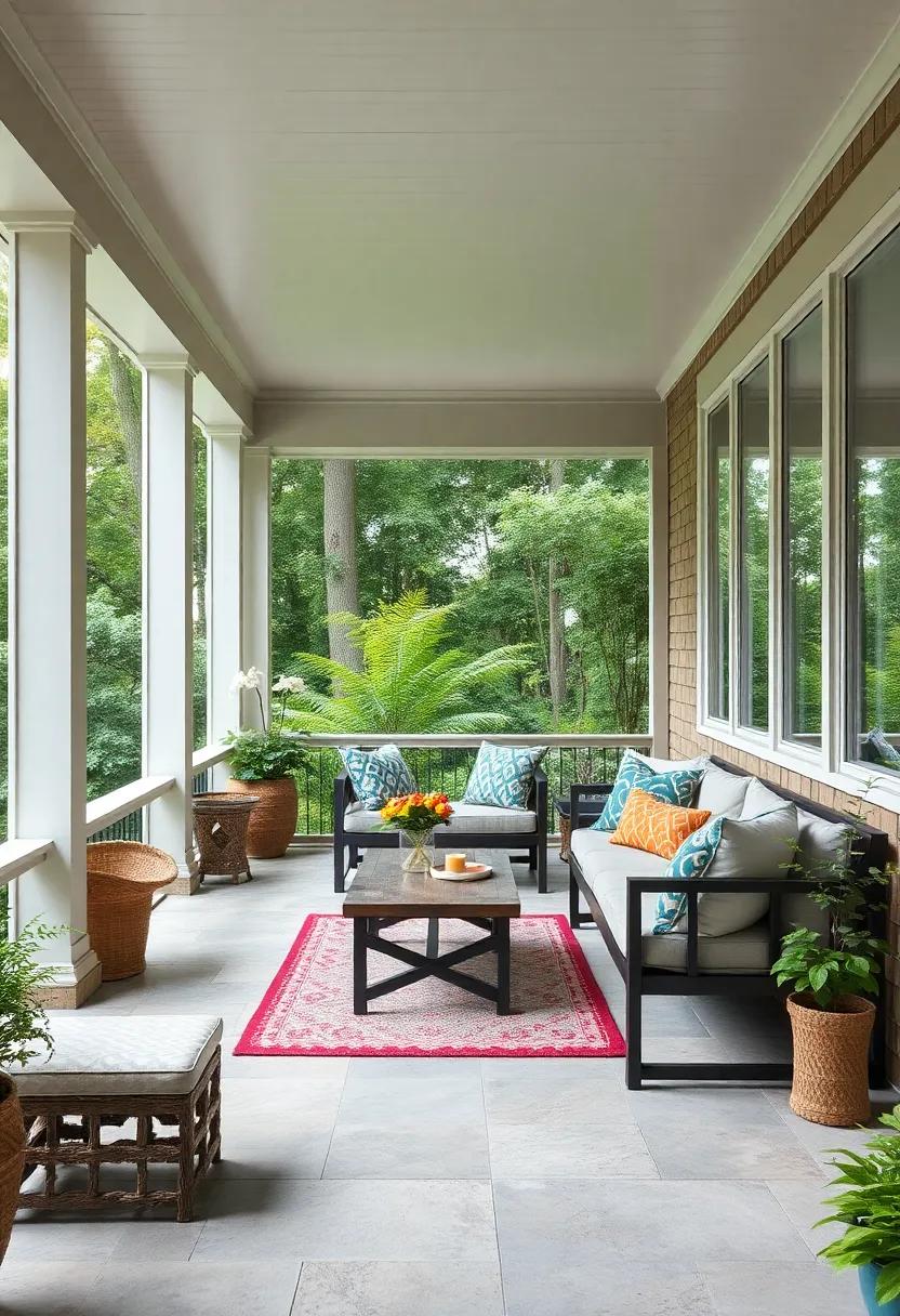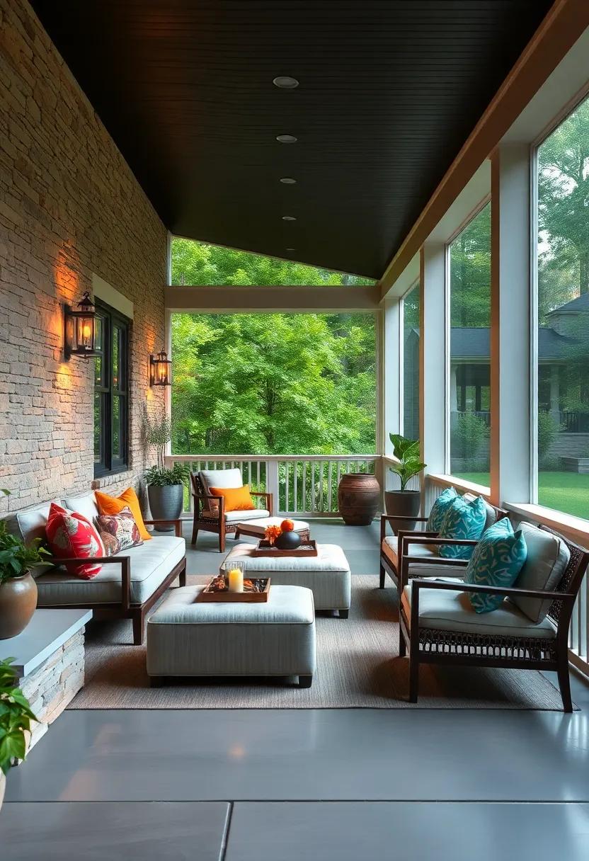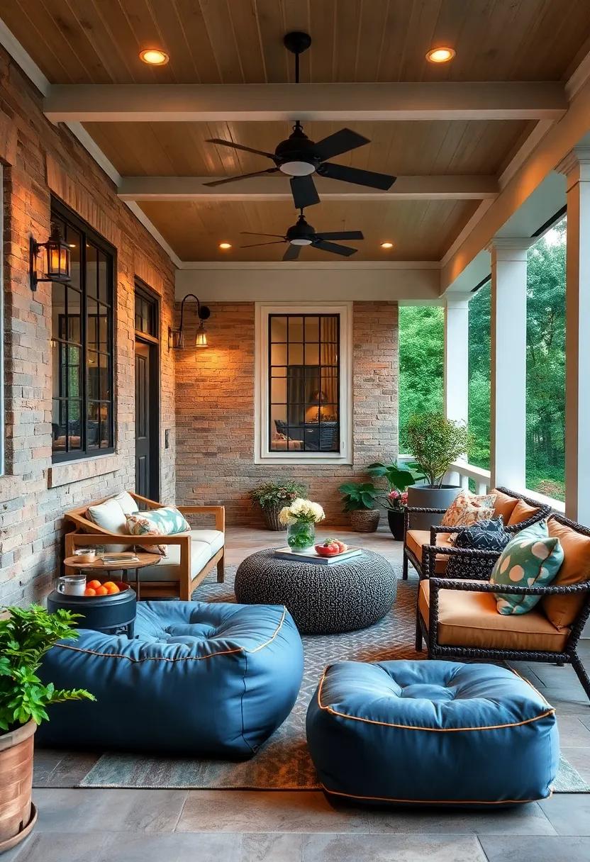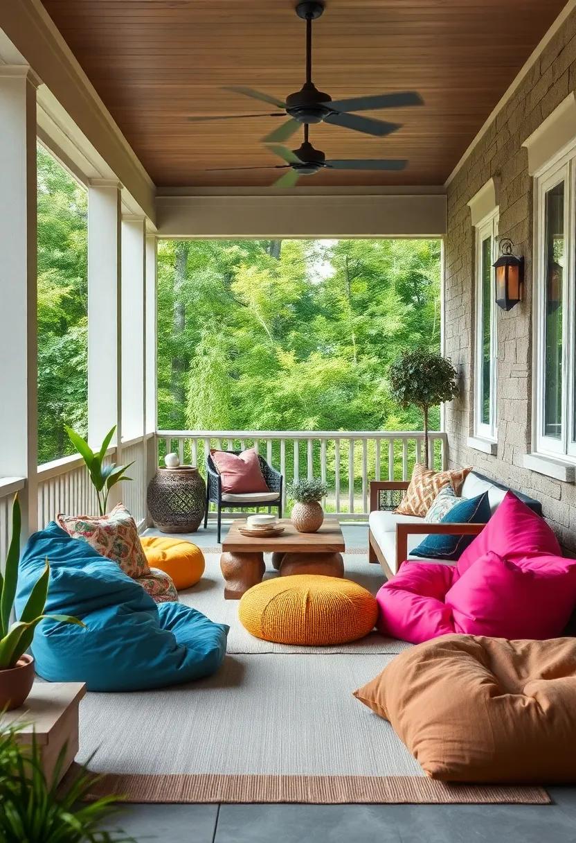 Incorporating bean bags in vibrant hues is the perfect way to infuse a playful energy into your screened porch design. Layering different types of textiles, such as chunky knit throws and soft cotton cushions, provides both comfort and aesthetic appeal. Imagine combining lush textures with plush bean bags in shades like sunny yellow, electric blue, or coral pink, creating a cheerful atmosphere that invites relaxation and socializing.The juxtaposition of tactile fabrics can create a sensory experience, enhancing your outdoor lounging spot while making it visually engaging.