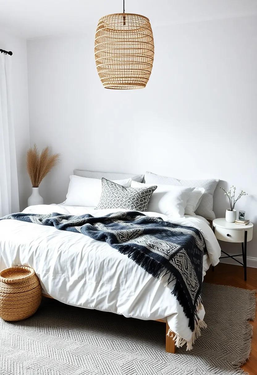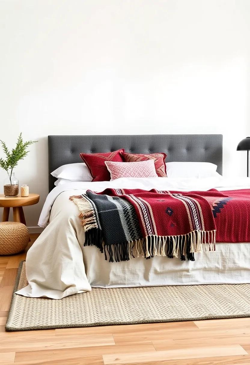 Transform your bedroom into a cozy sanctuary by experimenting with the art of layering. Begin with a rich, textured rug as your base—think natural fibers like jute or a patterned kilim. Then, introduce a bold ethnic throw blanket on top, letting it extend beyond the edges of the rug for an effortlessly chic look. This combination not only adds a unique visual element but also creates a sumptuous underfoot experience. Feel free to mix and match patterns; a vibrant Moroccan blanket juxtaposed with a geometric rug can create a striking, harmonious depth that invites comfort.