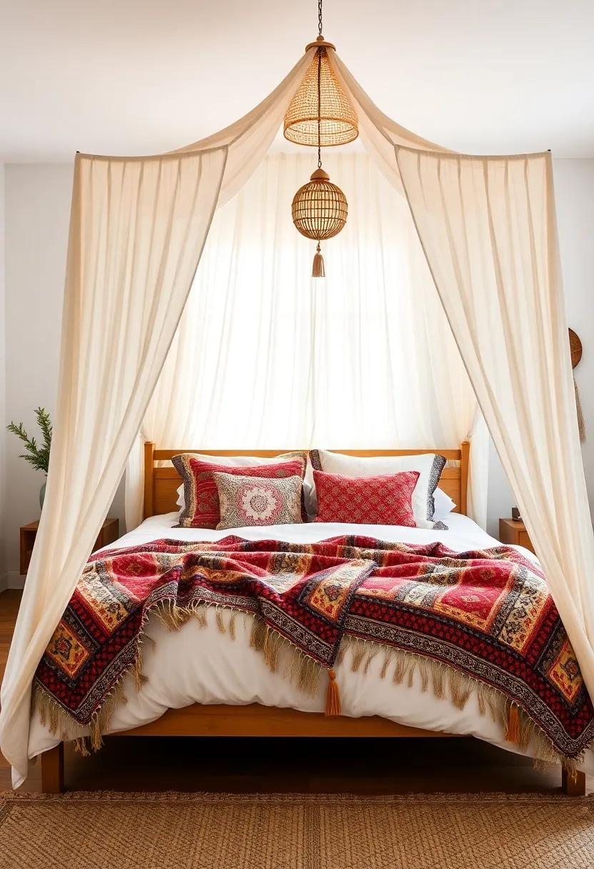 Whimsical Canopies: Transform your bed into a dreamy sanctuary by using ethnic throws as canopies, creating a fairytale-like atmosphere