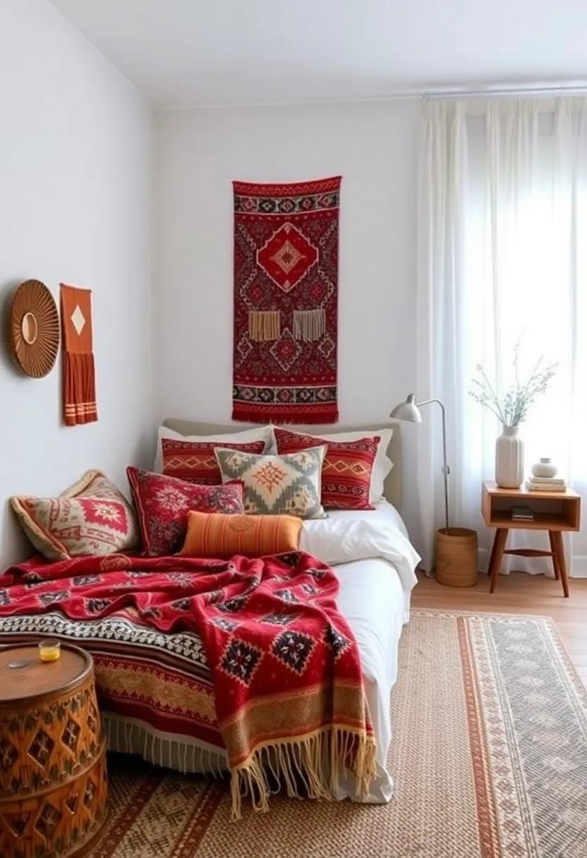 Artful Arrangements: experiment with creatively arranged ethnic throws across your bed and furniture to enhance the overall bohemian aesthetic