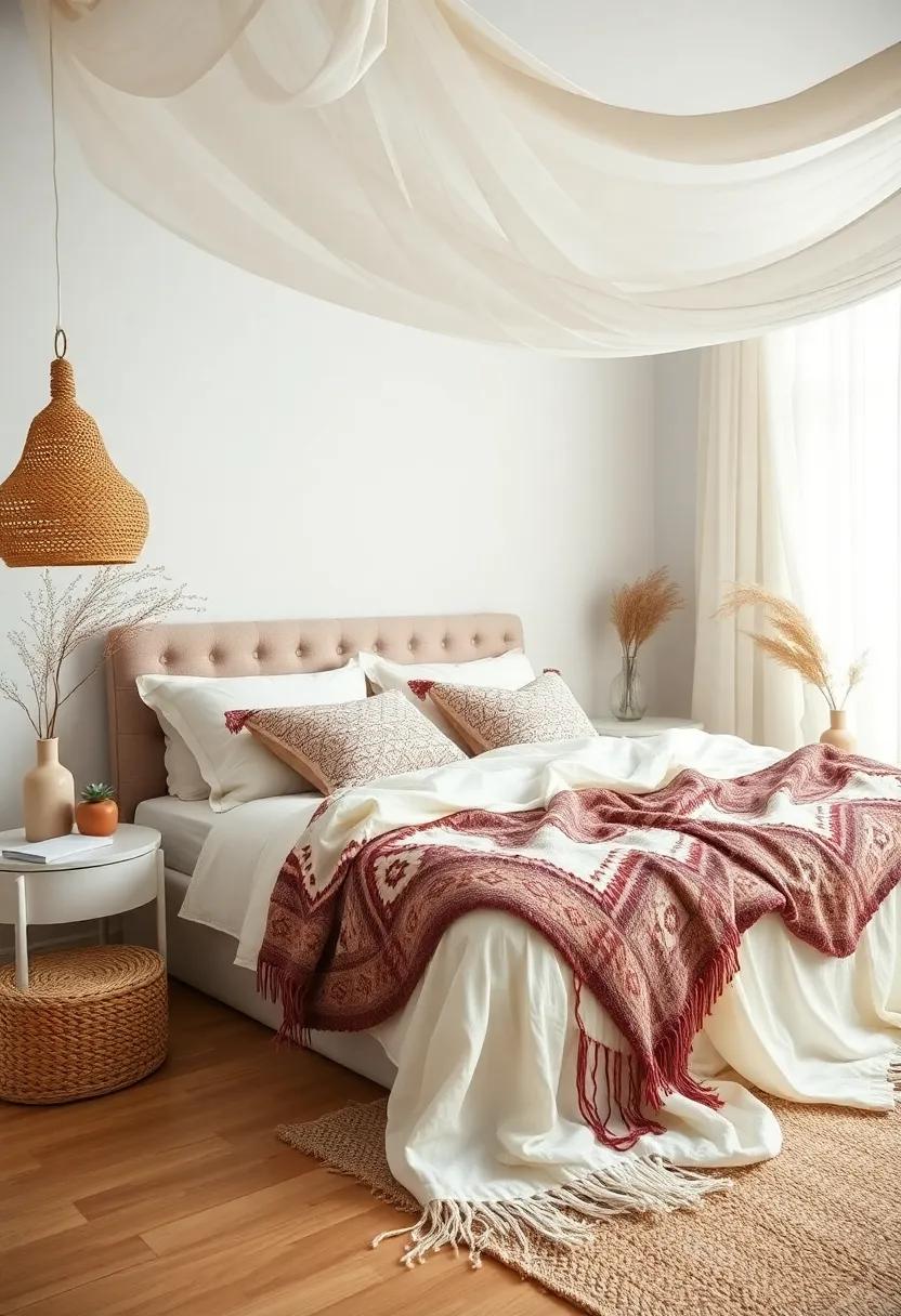 Imagine transforming your space into a dreamy oasis by weaving together delicate, flowing fabrics and enchanting ethnic throws. Start by layering sheer curtains that dance with the slightest breeze,allowing soft beams of light to filter through and create a warm,ethereal glow. Complement these with lightweight, textured bed linens in pastel shades, topped with a vibrant throw draped over the edge to add depth and visual interest. The juxtaposition of airy materials with the rich patterns of ethnic throws brings a unique balance, inviting a sense of whimsy and romance that draws you into the peaceful embrace of your boho sanctuary.