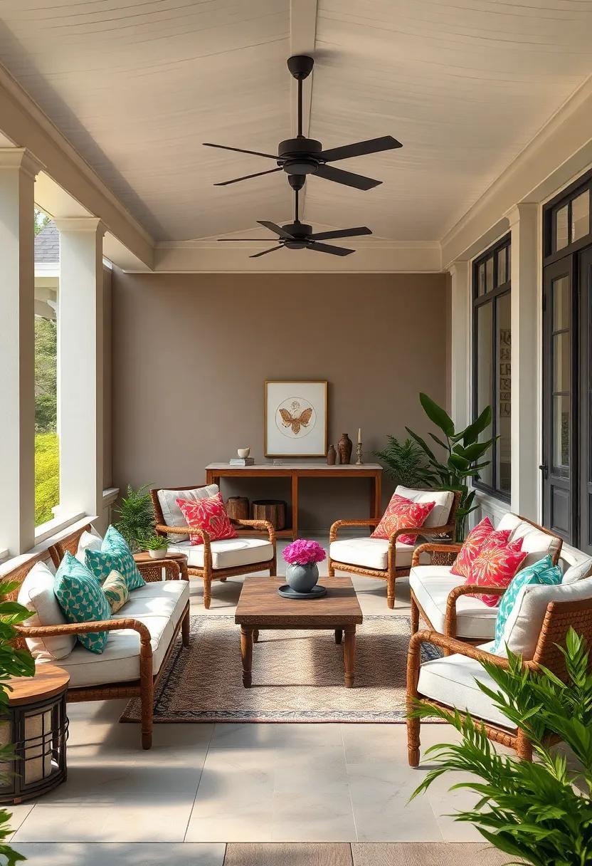 To enhance the cheerful ambiance, consider adding textiles and accessories that harmonize with your colorful furniture. Outdoor rugs, vibrant lanterns, or patterned toss pillows can tie the whole look together. By mixing different textures and shapes, you’ll create a dynamic visual experience that beckons relaxation and enjoyment. This design approach not only amplifies the use of your porch but also expresses your personal taste, turning it into a lively retreat that feels uniquely yours.