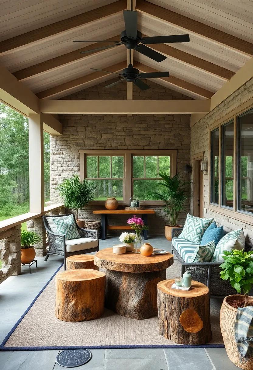 Rustic Retreat: Craft a log cabin feel with tree stump stools and a hand-crafted log table, making your porch feel like a woodland escape