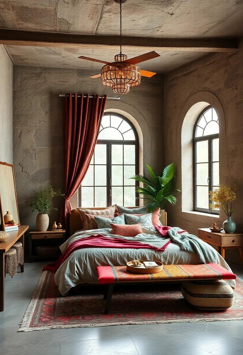 Paint your walls in soft, earthy tones to allow the vibrant patterns to stand out while giving the room a bohemian vibe.Incorporate whimsical decor elements, such as macramé wall hangings or hanging plants, which add depth and an organic touch to your artful retreat. Choose mismatched bedside tables and lamps to break the mold of conventional design; think driftwood, ornate metal, and painted finishes.Create a small reading nook with a plush chair adorned in a colorful fabric and a whimsical side table, completing the dreamy aesthetic that is both playful and inviting.