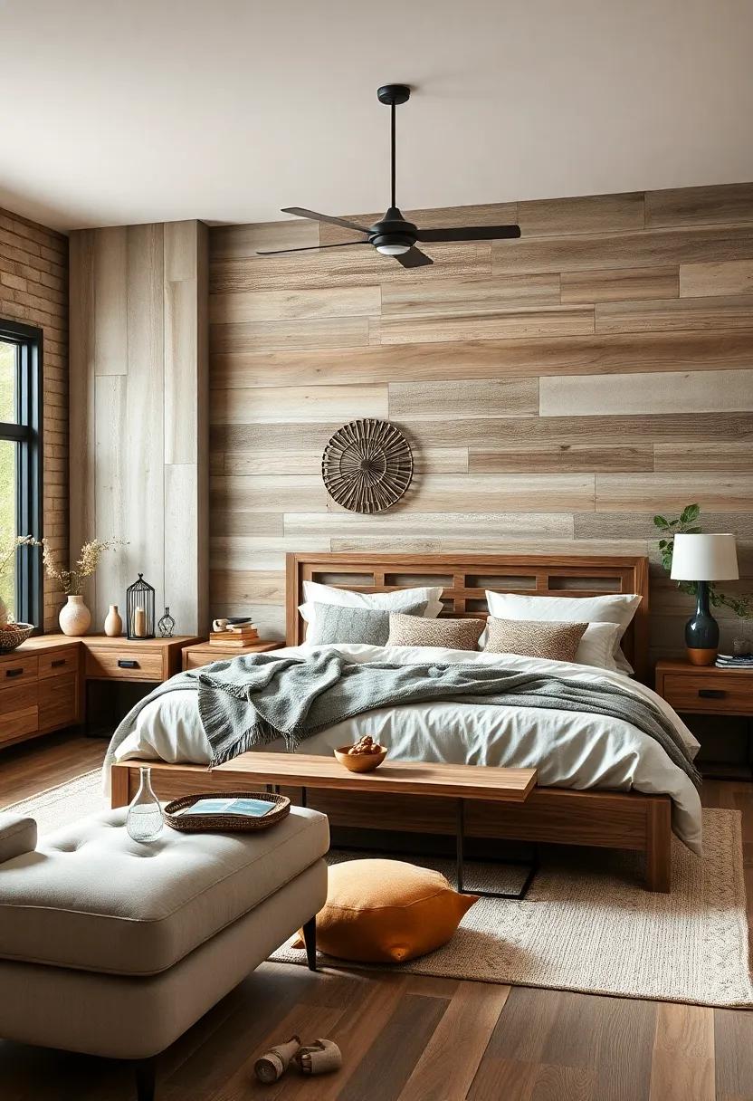 The seamless blend of rustic wood elements with contemporary design offers a cozy yet refined atmosphere in any bedroom. Imagine a sleek platform bed framed with reclaimed wood, adorned with soft linens in muted earth tones. This combination captures the heart of farmhouse charm while maintaining a minimalist edge.Accent pieces like geometric lamps and modern art prints can elevate the space, injecting personality and warmth without overwhelming the simplicity that defines this aesthetic. Incorporating large windows that invite natural light complements the visual appeal, enhancing the organic colors of the wood and textiles.