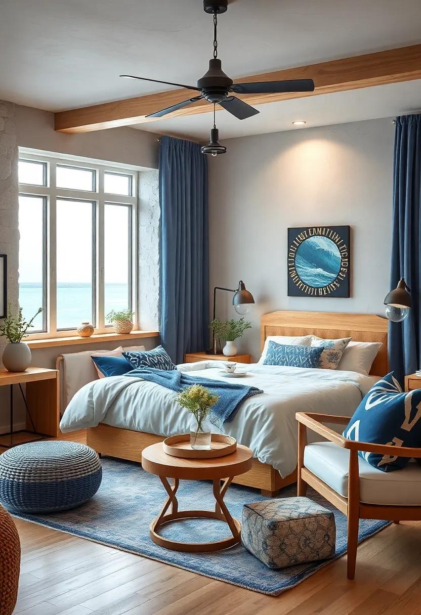 To further enhance the maritime vibe, integrate ocean-inspired textiles and accessories. Think of decorative throw pillows in striped patterns or playful whale motifs that complement the navy tones. A woven jute rug can evoke the sensation of sandy shores, grounding your space with a natural element. Don’t forget to add some art prints of coastal scenes or framed nautical maps to the walls, allowing you to transport yourself to the seaside without ever leaving your room. This combination of thoughtful furnishings and accessories will ensure your bedroom is a stylish yet soothing sanctuary.
