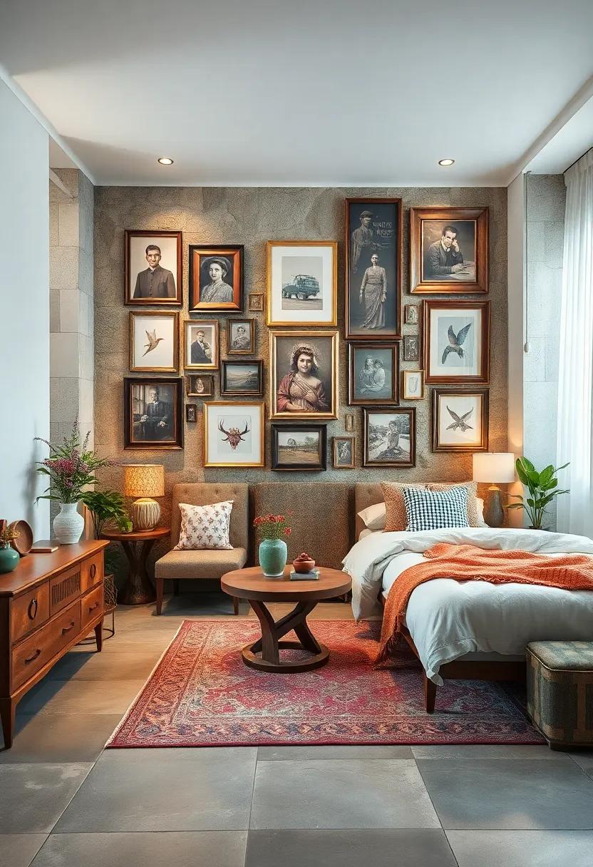 Transform your bedroom into a nostalgic haven by curating a stunning collection of vintage prints and cherished family photographs. Selecting a variety of eclectic frames allows you to showcase not just the artwork but also your personal history. Mix and match sizes, styles, and colors to create a visually engaging gallery wall that invites conversations and sparks memories. Consider incorporating elements like ornate gold gilded frames for a luxe touch, or rugged wooden frames for a rustic vibe, each telling its own story while enhancing the overall aesthetic of your space.