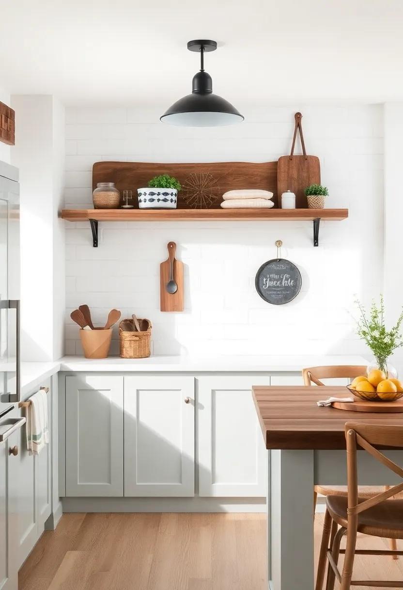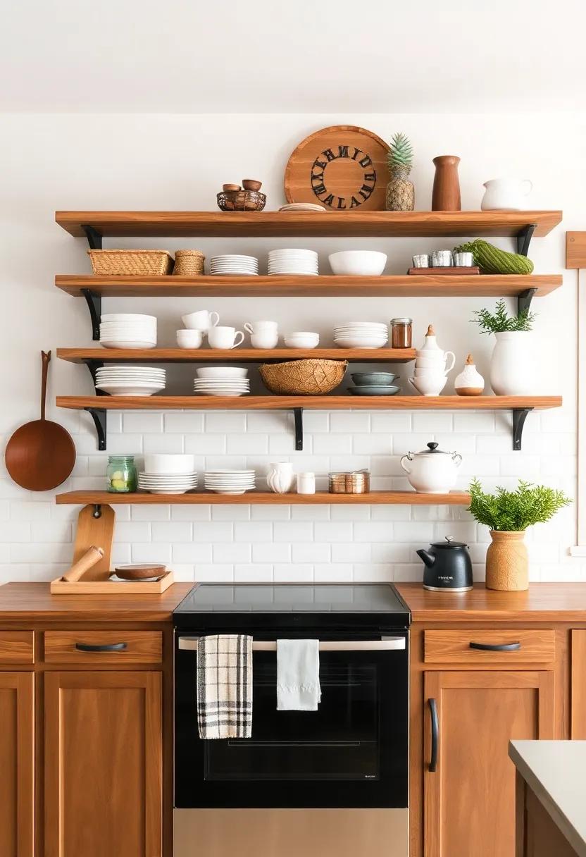 Rustic Open Shelving: Install open wooden shelves adorned with dishware and decorative pieces, creating an inviting and practical display
