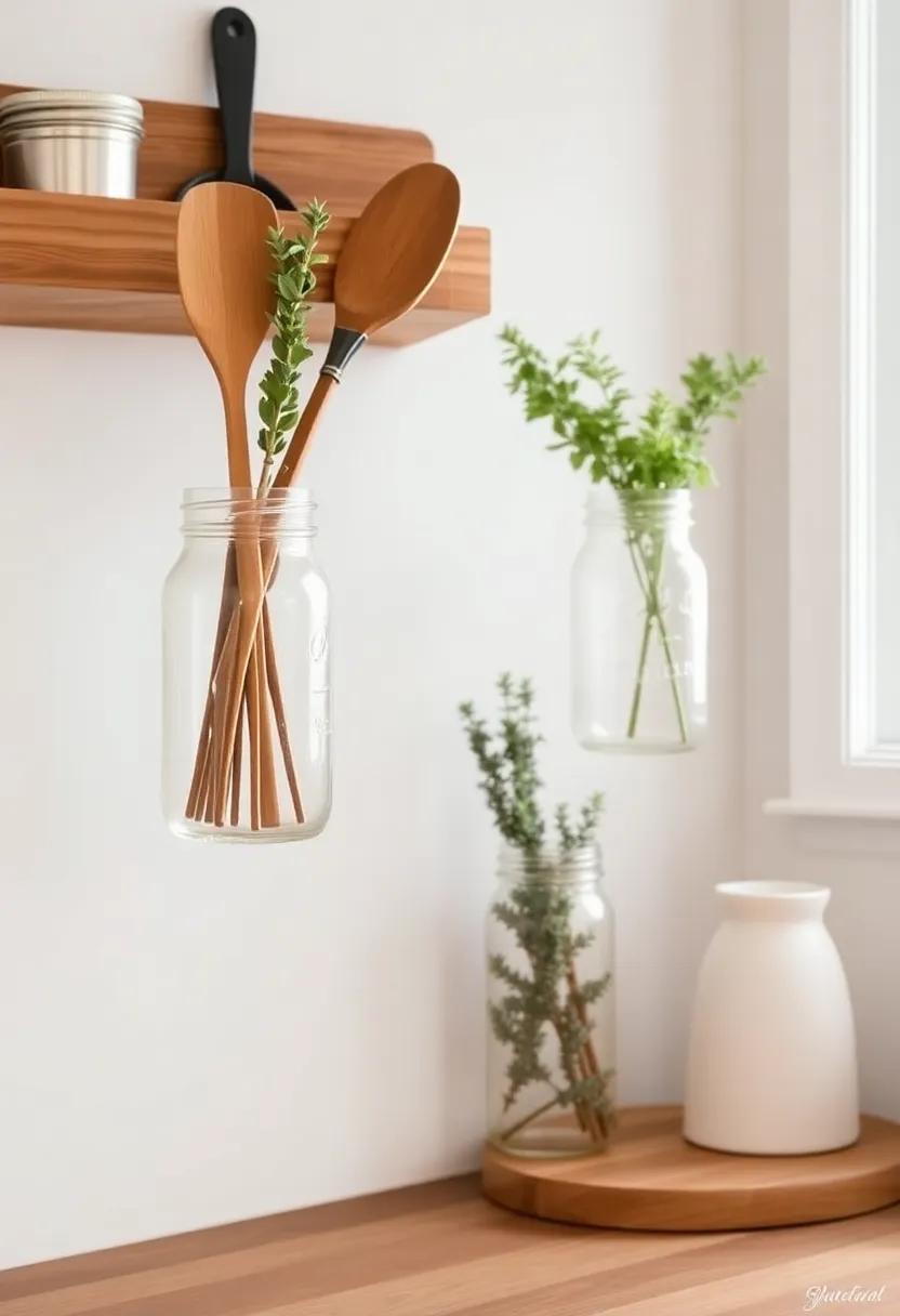 Mason Jar Storage: Utilize mason jars filled with utensils or dried herbs, hanging them on display for both functionality and a rustic touch