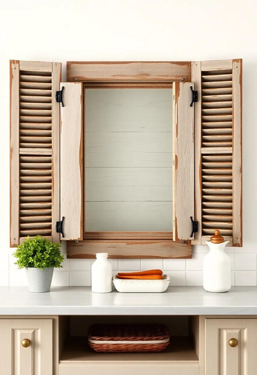 To make the most of your distressed shutters, mix and match with various decor items. Think artful black and white photographs or vintage kitchen tools displayed along the edge. You can also create an organized yet charming display with shelf brackets for your favorite cookbooks. A simple color palette of whites, greens, and soft blues can accentuate the shutters, making them pop even more. Entertain your guests with a mural of reclaimed barn wood behind your shutters, which will enhance their beauty while reinforcing the rustic theme. Let your creative juices flow as you experiment with different arrangements!