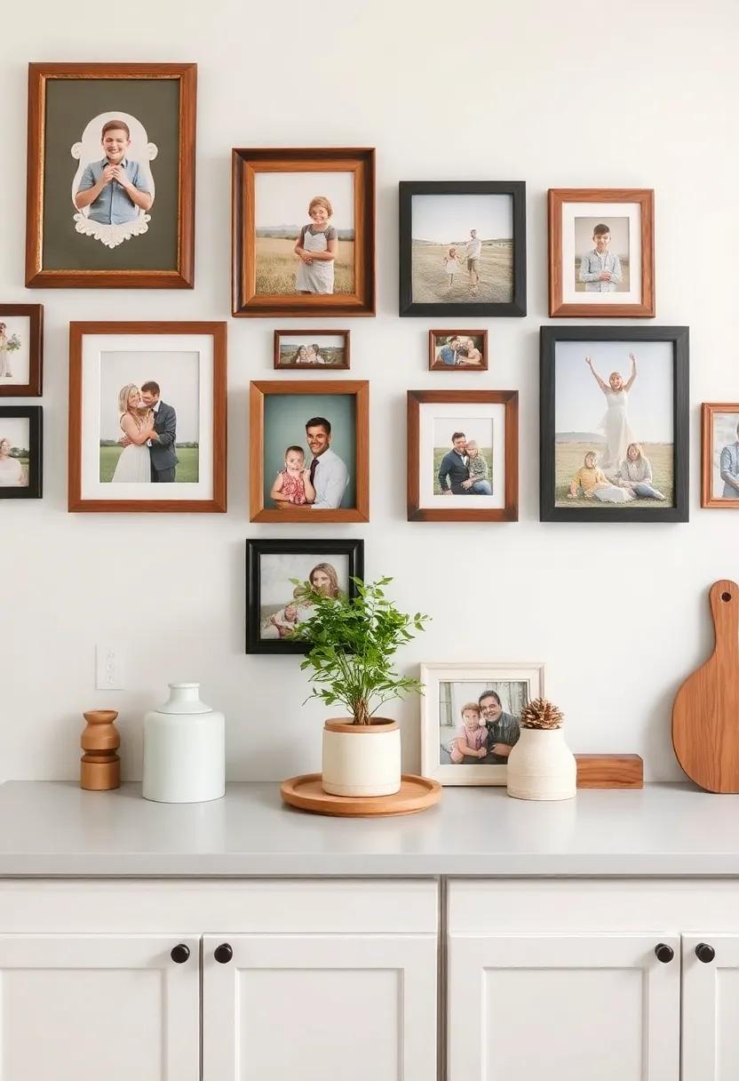 Consider arranging your photos in a visually appealing layout, like a grid or a salon-style arrangement, to create a dynamic visual focal point. To enhance the warmth of your farmhouse kitchen,you can incorporate accessories like small shelves or decorative hooks around the photo display. Add captions or handwritten notes beside special photos to tell the story behind them, inviting viewers to take a trip down memory lane each time they step in the kitchen.