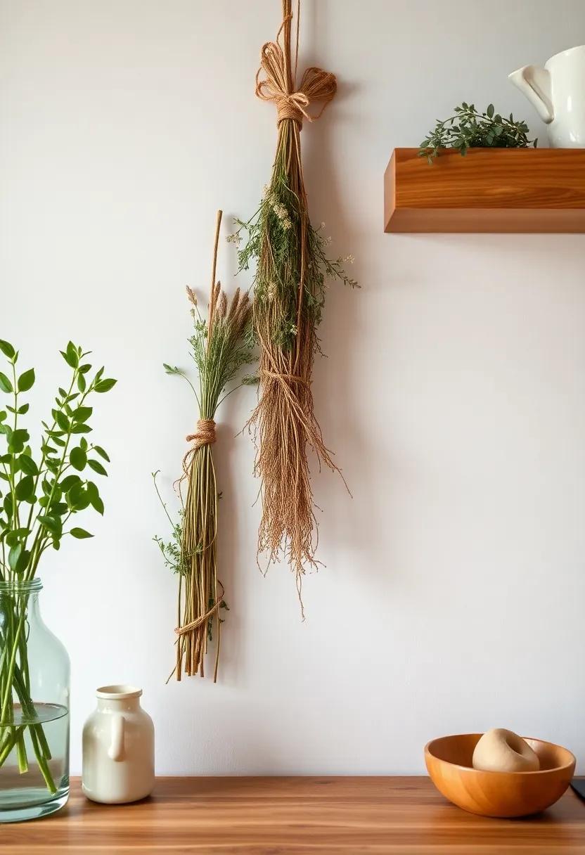 Herb Bundles: Dried herb bundles tied with twine and hung on the wall not only look beautiful but also bring a delightful scent to your kitchen