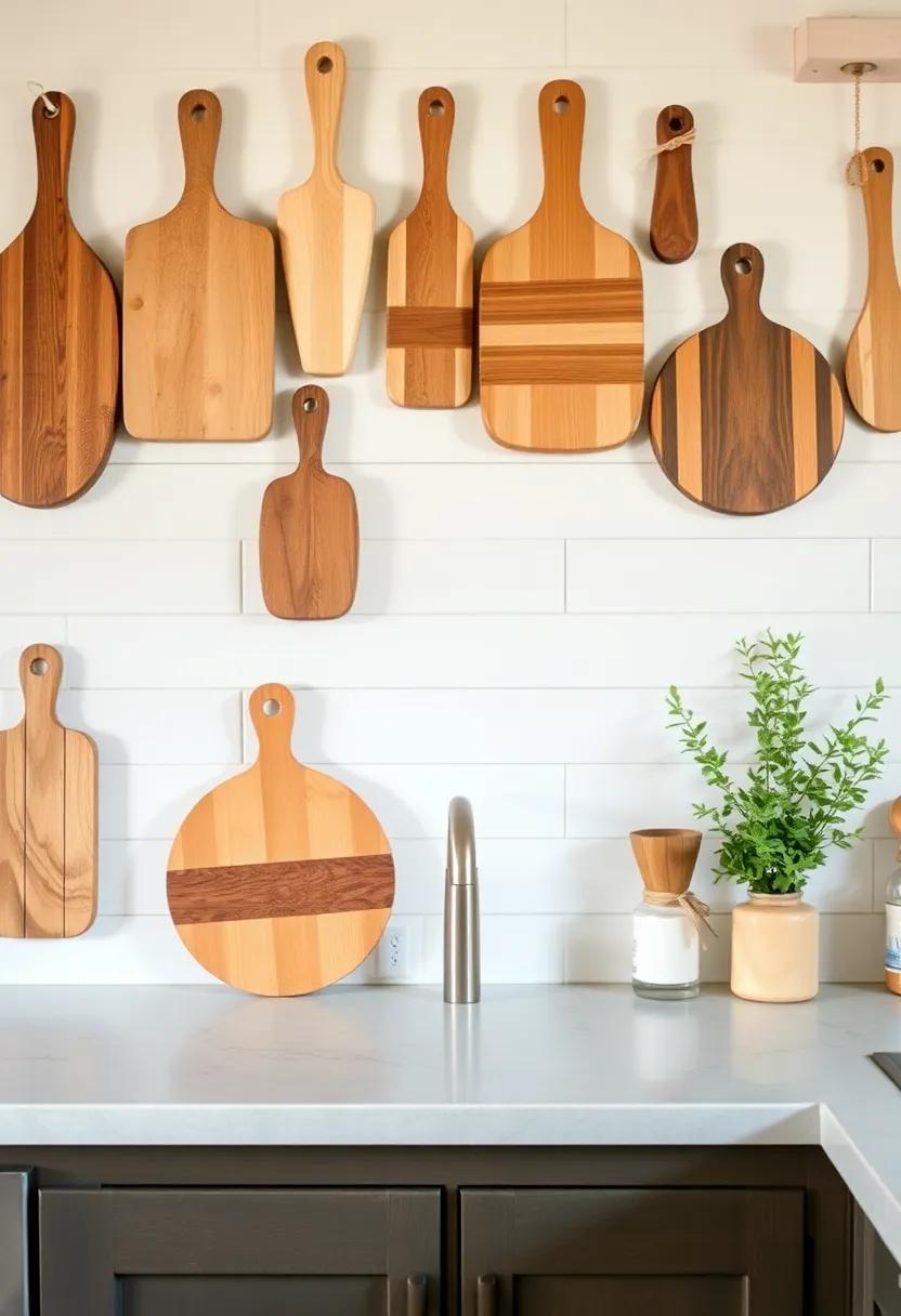 Transform a blank wall into a stunning focal point by arranging a collection of vintage cutting boards that bring both charm and character to your kitchen. These rustic pieces, with their distinct patinas, shapes, and textures, can effortlessly complement your farmhouse aesthetic.To create visual interest, mix boards of various sizes and shapes—consider incorporating round, rectangular, and even uniquely shaped boards. Hang them at different heights to add depth and dimension, making your kitchen feel inviting and lived-in.