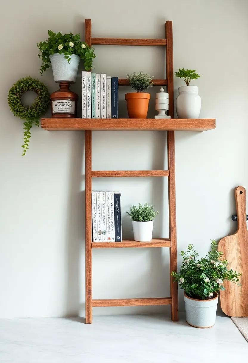 Ladder Shelf: lean a rustic ladder against the wall to display cookbooks, potted plants, or seasonal decor, maximizing vertical space elegantly