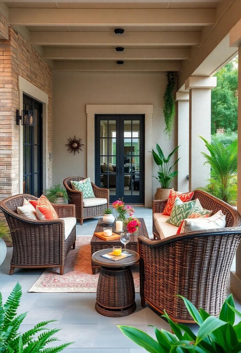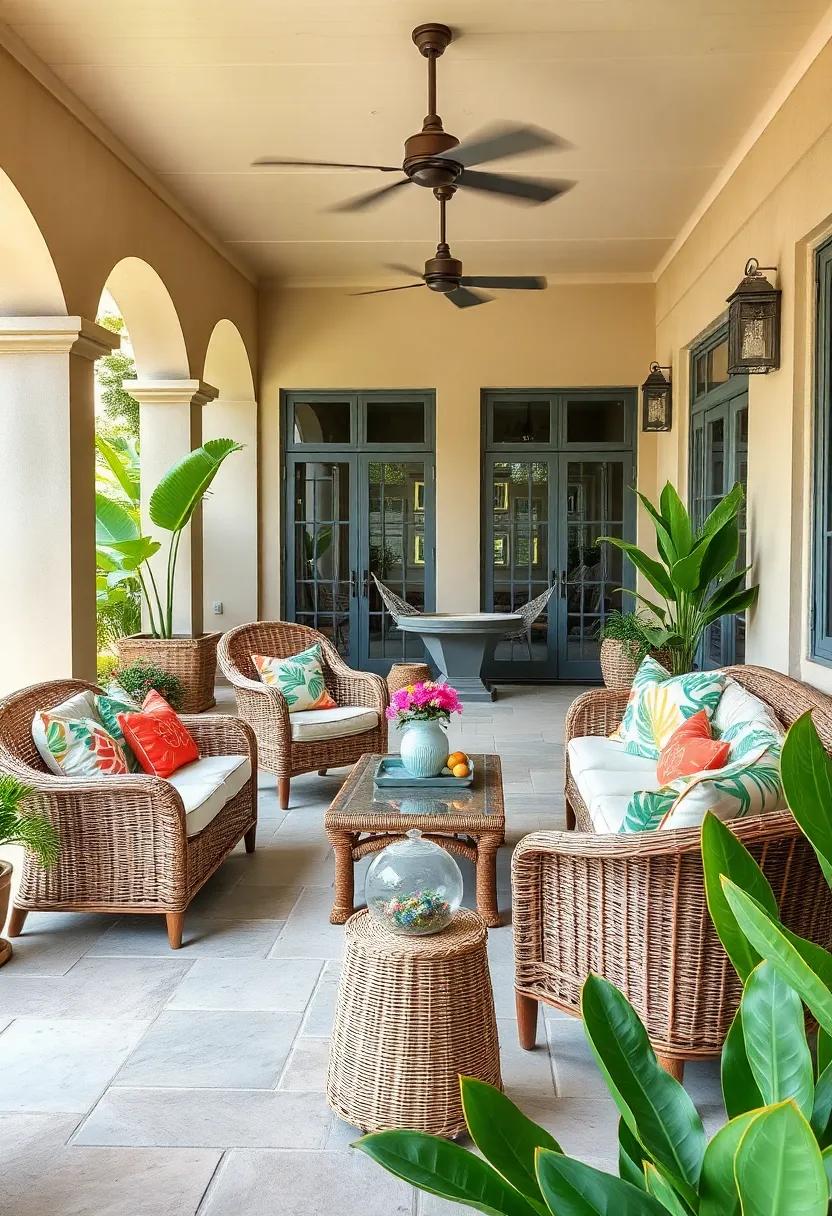 Tropical Getaway: Infuse your patio with tropical vibes using wicker furniture adorned with palm print cushions and vibrant outdoor accessories