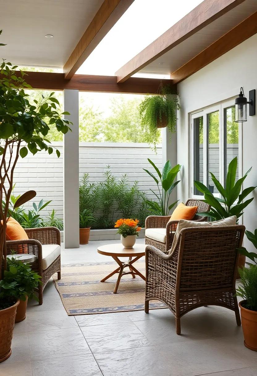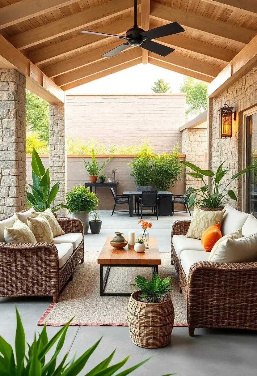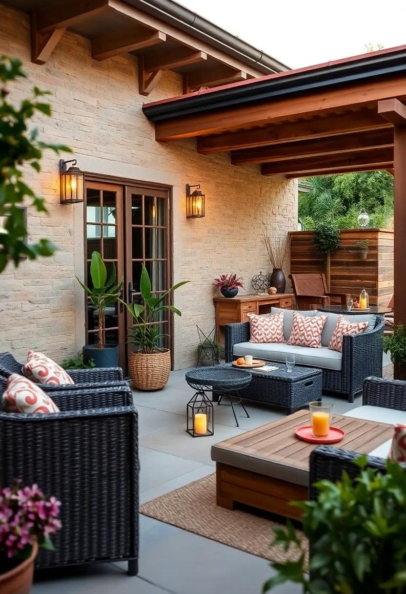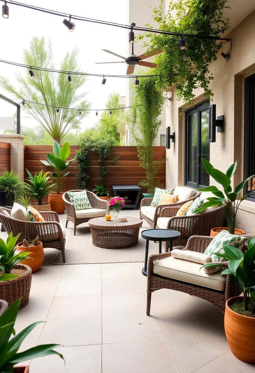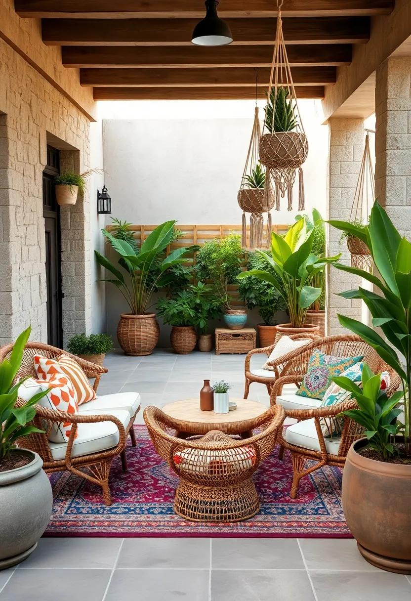 To complete this free-spirited design, hang some macramé planters from beams or tree branches, filled with lush greenery and trailing vines. Consider varying the heights of the planters to create an eye-catching display that draws the eye upward and adds depth to your patio aesthetics. Accentuate the look with a few organic elements like clay pots or rustic lanterns. The interplay of textures—woven fibers from the wicker, soft fabric of the rugs, and the natural feel of the plants—will establish a charming sanctuary that perfectly embodies bohemian style.