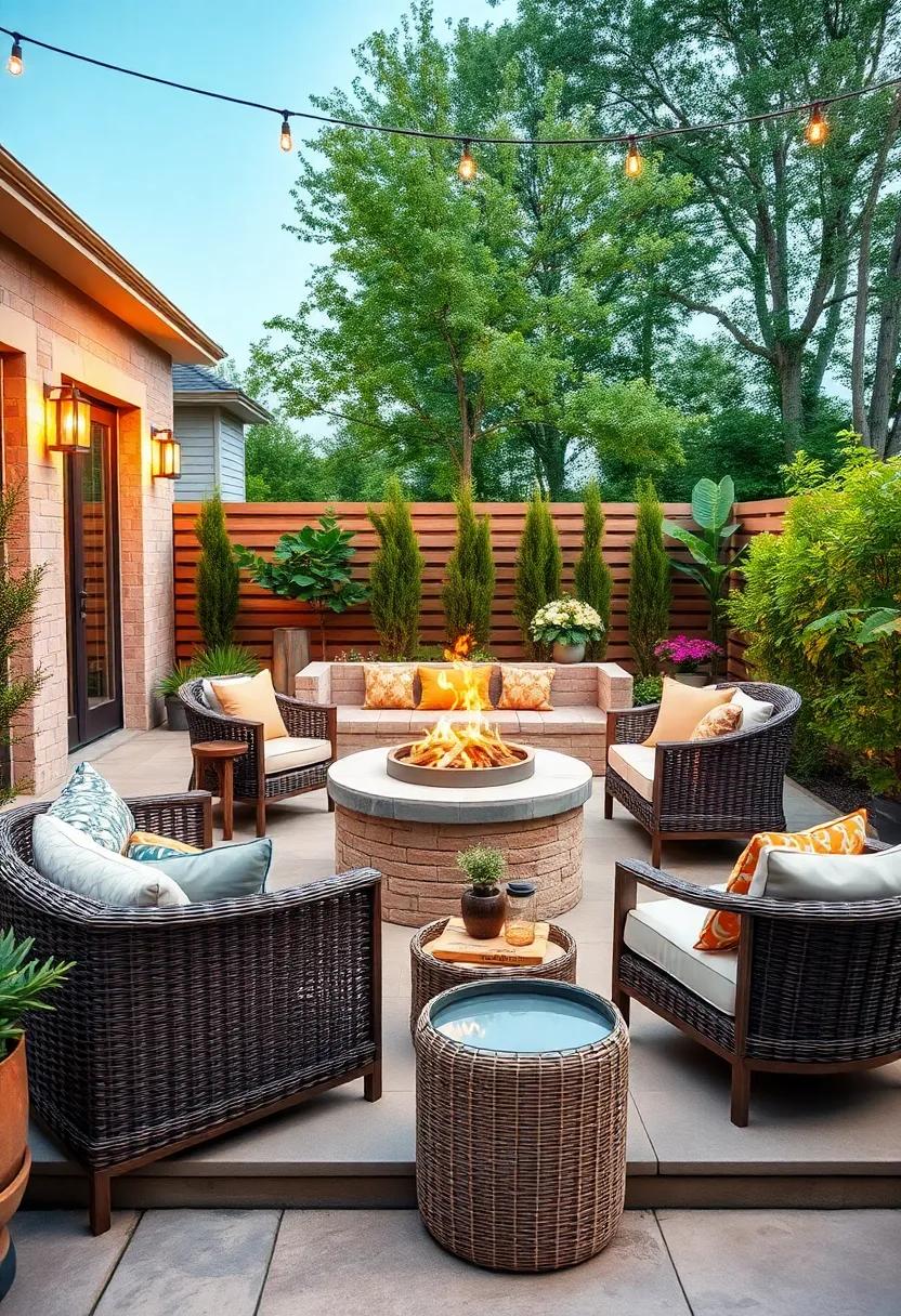 Chic Fire Pit Gathering: arrange a modern wicker seating arrangement around a fire pit, enhancing your outdoor space with warmth and a cozy ambiance