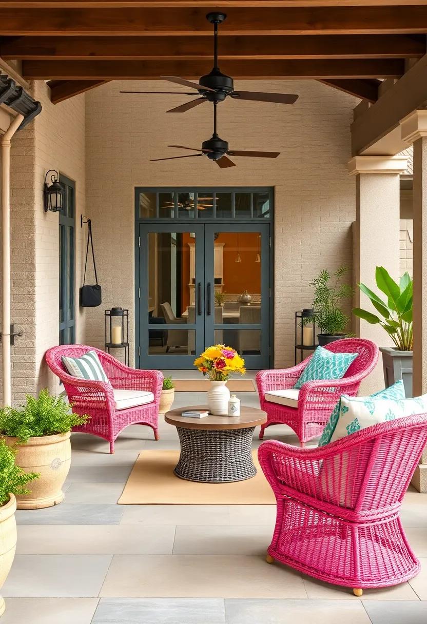 Color Pop Accent: Choose bright-colored wicker chairs as statement pieces against a more subdued backdrop, creating a cheerful focal point