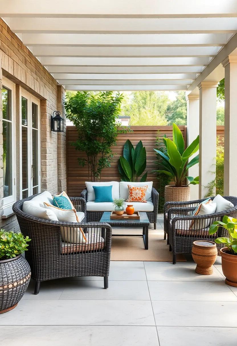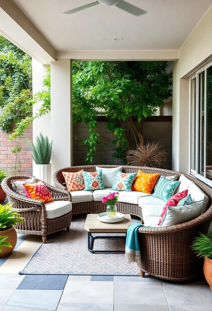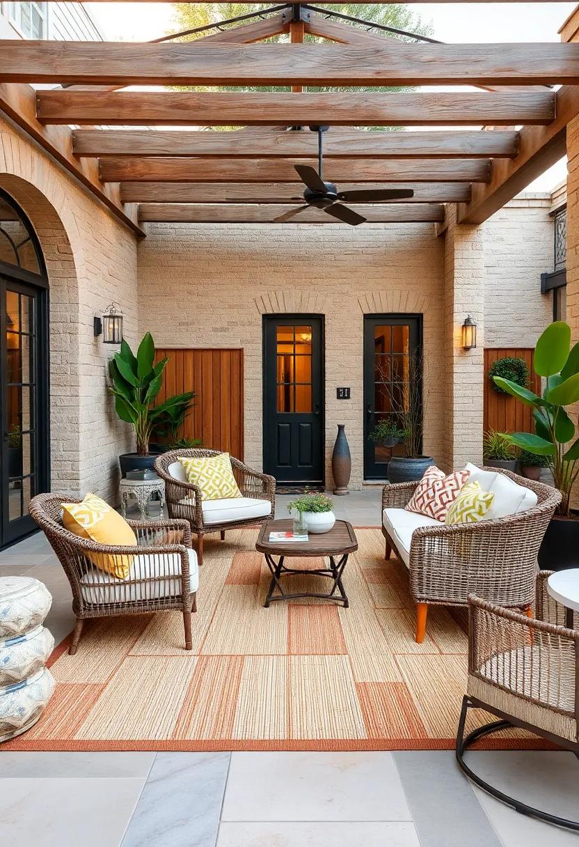 Infuse your patio with an artistic flair by merging an array of colorful wicker chairs that showcase your personality and creativity. Choose chairs in vibrant hues like deep turquoise, sunny yellow, and earthy terracotta to create an eclectic look. Pair these with equally lively patterned rugs that feature bold prints or boho motifs. Look for rugs with geometric shapes or floral patterns that evoke a beachy vibe or a desert sunset. This combination will not only bring warmth to your outdoor space but also encourage an inviting atmosphere for leisurely gatherings and deep conversations.