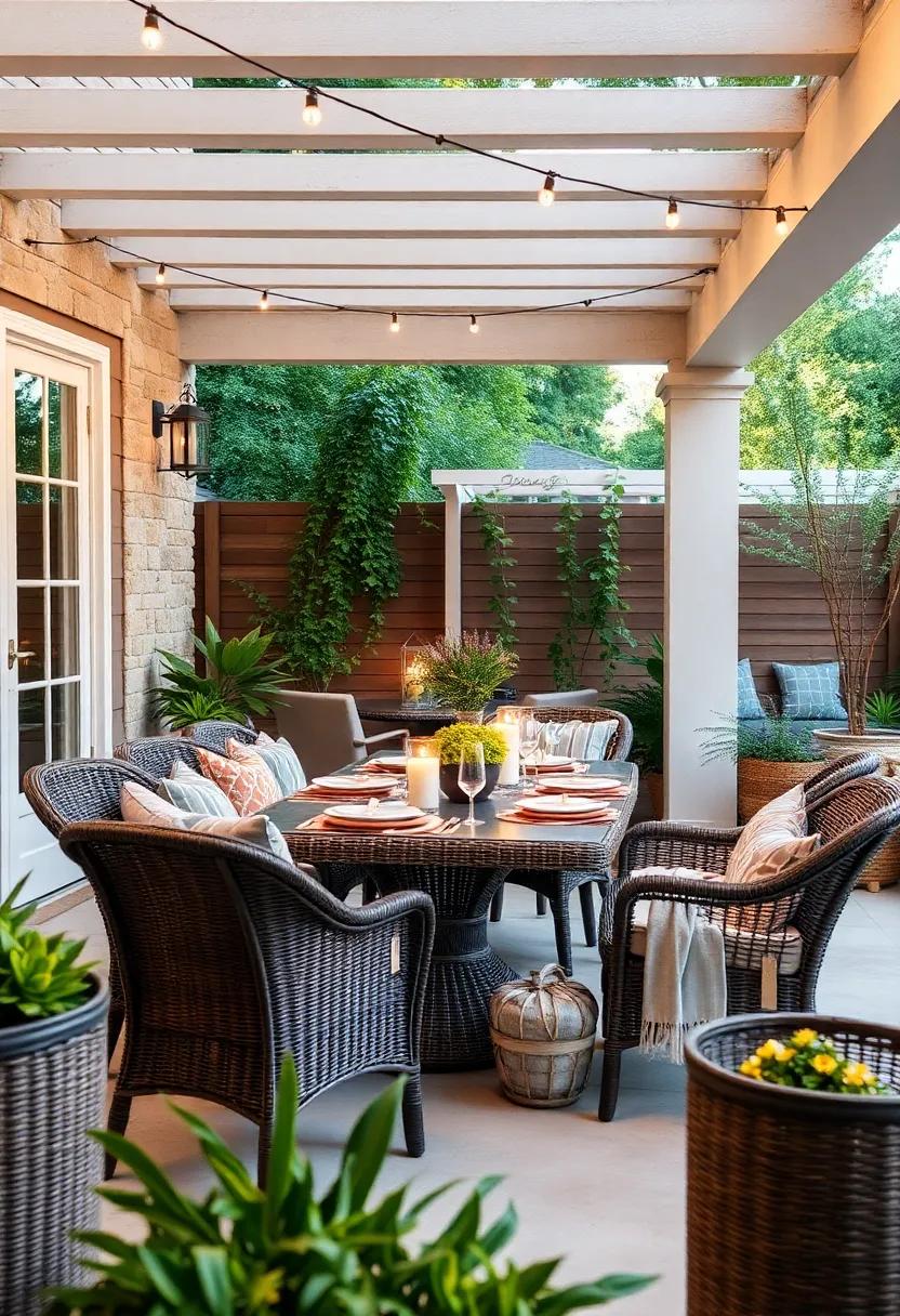 Dining Delight: Install a stylish wicker dining set for alfresco meals, accented with soft table linens and outdoor candles for intimate evening dinners