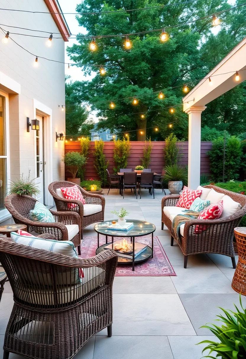 Festive Flair: Deck out your patio with string lights and colorful cushions on wicker chairs for a festive gathering space perfect for summer nights
