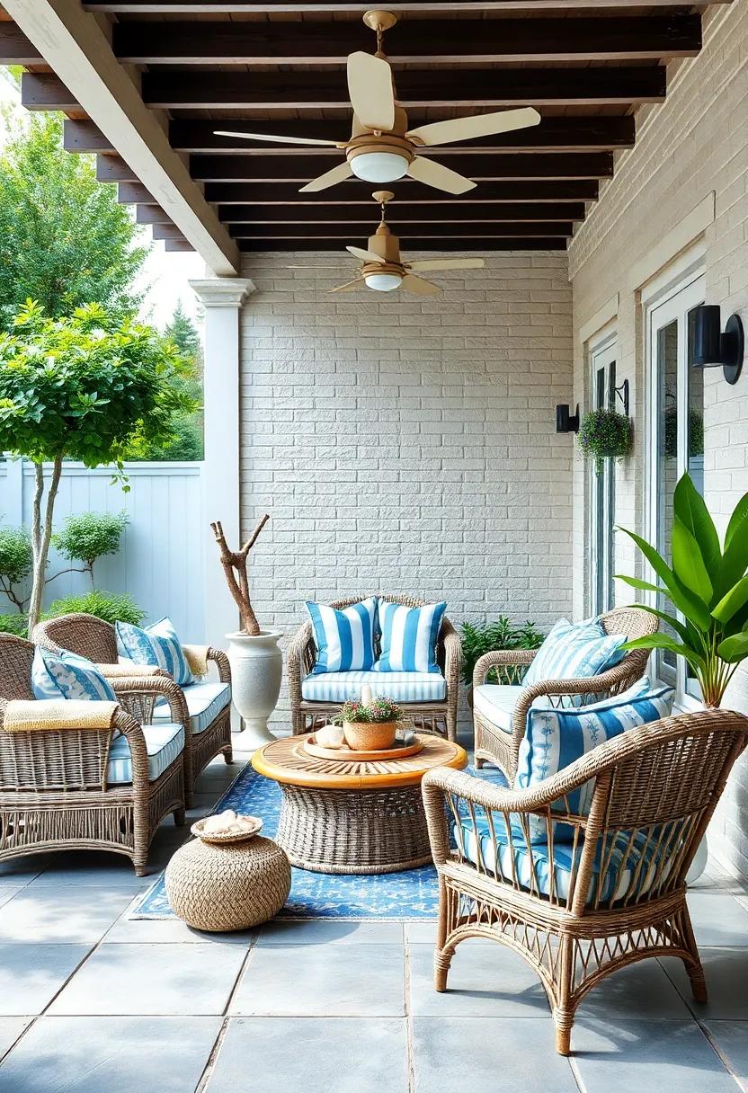 nautical Escape: Channel a seaside retreat by using blue and white wicker furniture, complemented by nautical-themed decor and plenty of seashell accents