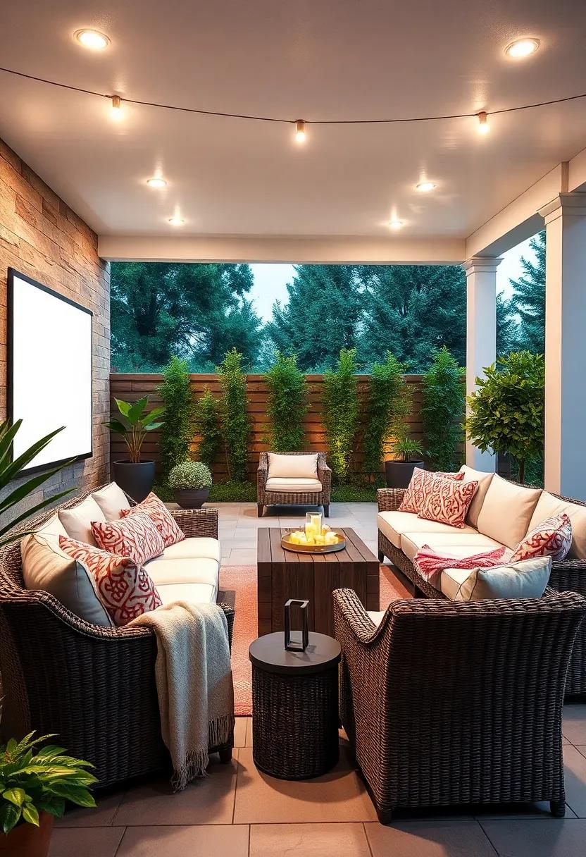 Transform your patio into an enchanting outdoor cinema that will impress your friends and family. Start by arranging comfortable wicker seating to create a cozy atmosphere; think plush cushions and soft throws that invite you to sink in and relax. Set up your projector on a sturdy table or stand, ensuring it has a clear view of the blank wall or screen you’ve designated for movie nights. Consider string lights above the seating area for added charm, providing soft ambient lighting that enhances the cinematic experience without being too harsh.