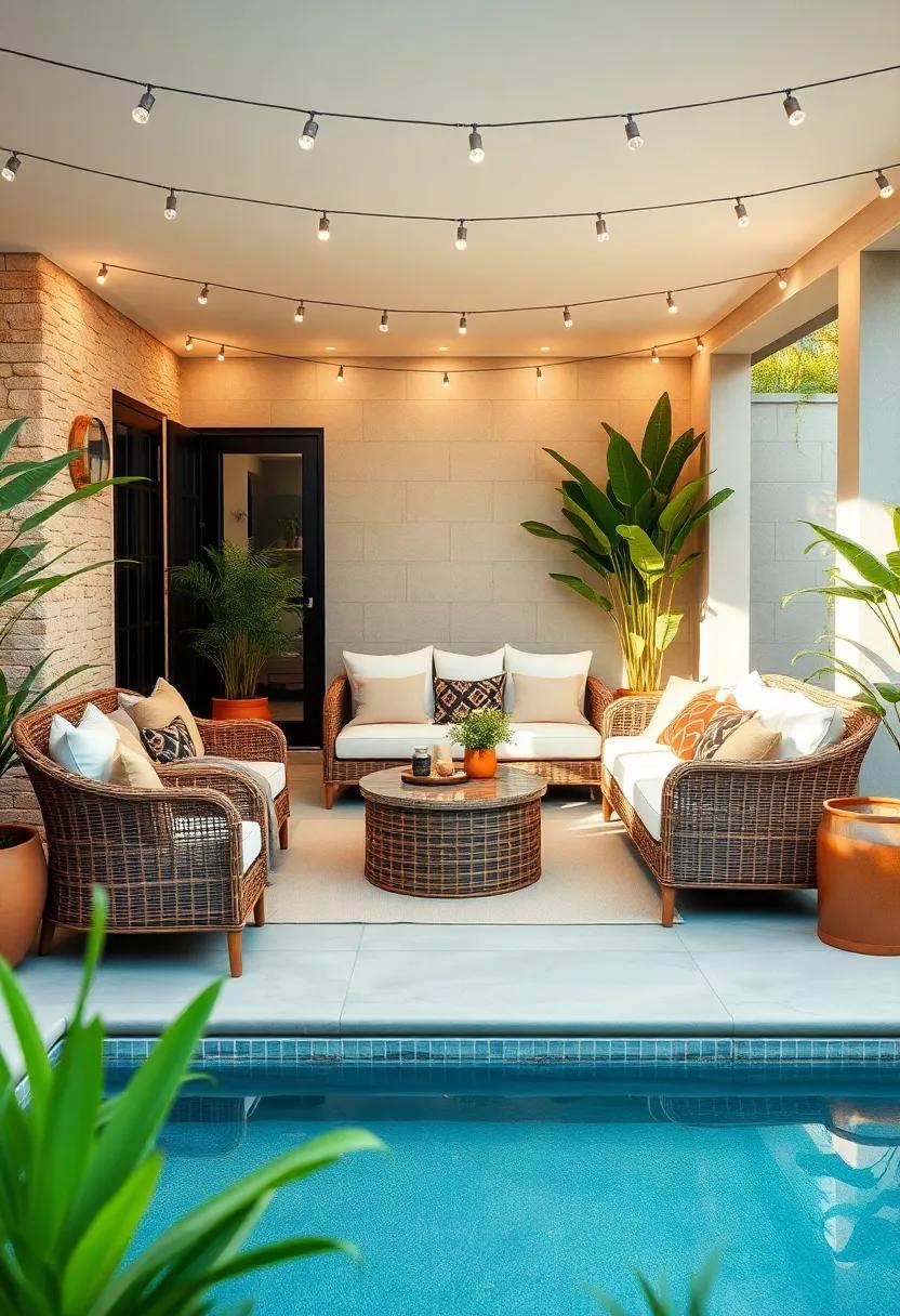 Serene Lounge Area: Create a serene lounge area with a large wicker sectional, soft lighting, and plenty of greenery, perfect for unwinding after a long day