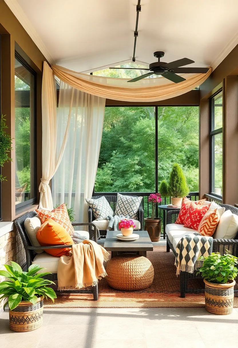 Creating a snug atmosphere in your screened porch can be effortlessly achieved with the simple addition of sheer curtains or draped fabrics. By hanging these lightweight materials from the ceiling or walls, you can define your space while allowing natural light to filter through, casting gentle shadows and creating an ethereal glow.This soft enclosure not only enhances privacy but also invites a sense of warmth, encouraging you to relax with a good book or enjoy a cup of tea while taking in the serene views of your garden.