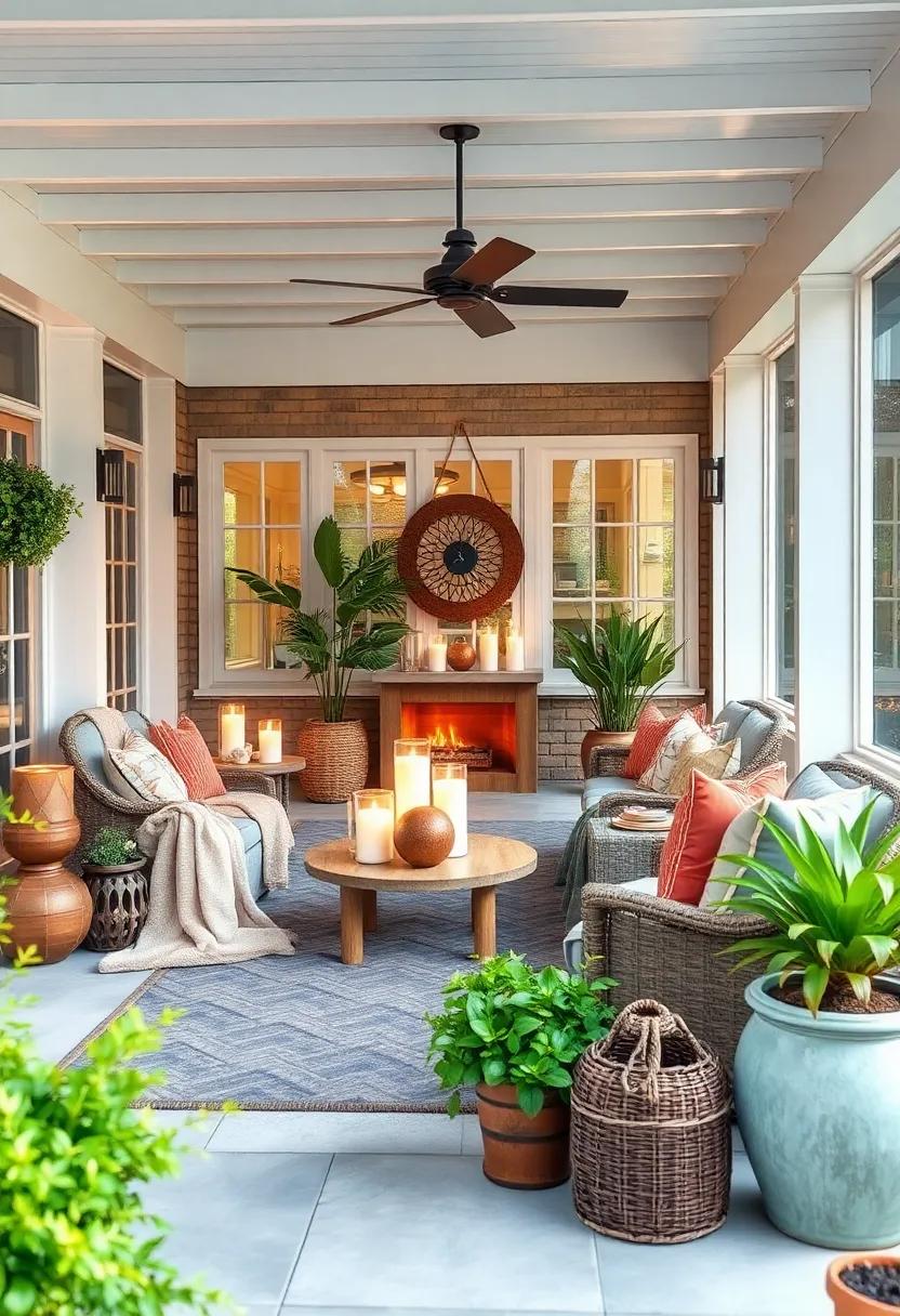 Candles are an age-old secret for setting a cozy tone, and they can be creatively used in various ways to enhance your outdoor experience. Arrange pillar candles on a decorative tray alongside a small bouquet of wildflowers for a charming centerpiece or scatter tea lights around the porch for a gentle twinkle. For a more whimsical feel, opt for hurricane lamps filled with colored glass or pebbles to complement your decor themes. With the right combination, these lighting elements will not only brighten your evenings but also heighten the allure of your cozy escape.