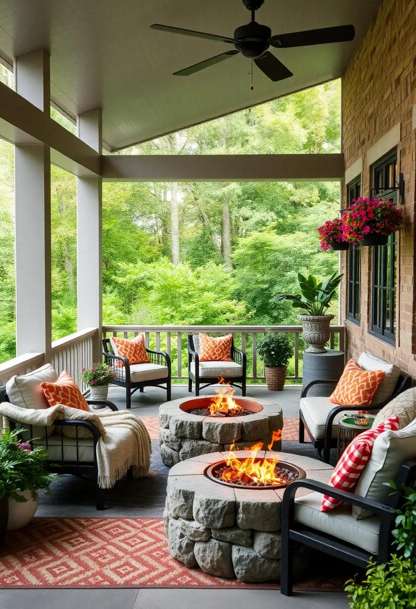 to truly elevate your fire pit experience, think about how you can enhance the area surrounding it. Soft seating such as plush outdoor cushions and blankets can transform your porch into a snug retreat where everyone feels comfortable. Use natural elements like stone or wood to bring warmth and charm, and consider adding a few small tables to hold drinks or snacks. For an enchanting touch, string lights overhead or surround the fire pit with potted plants. Here’s a quick table to help you visualize how to accessorize your space:
