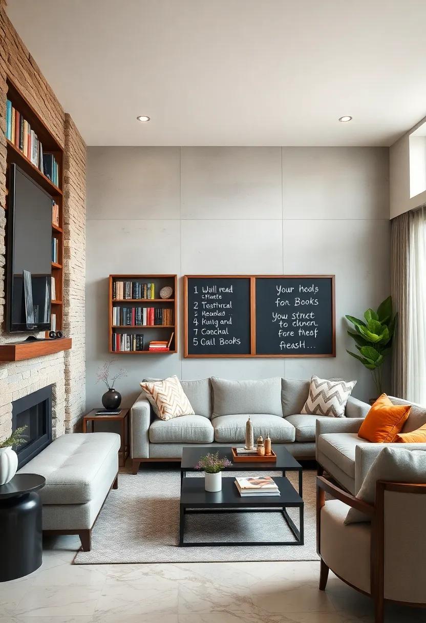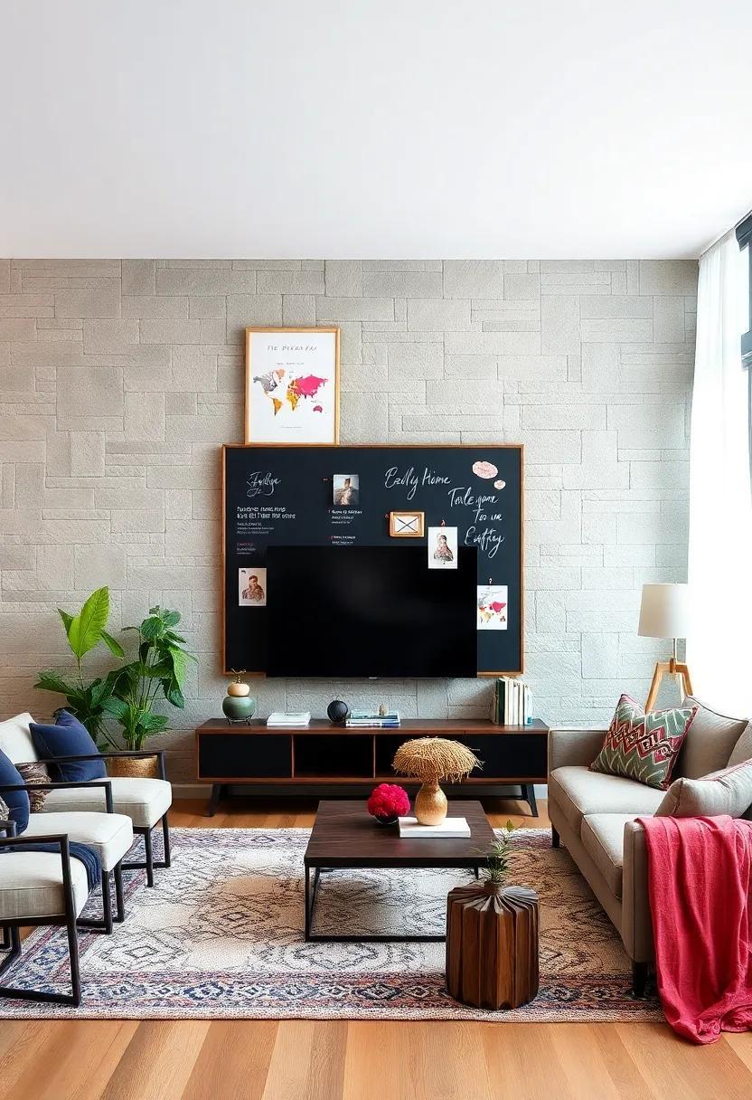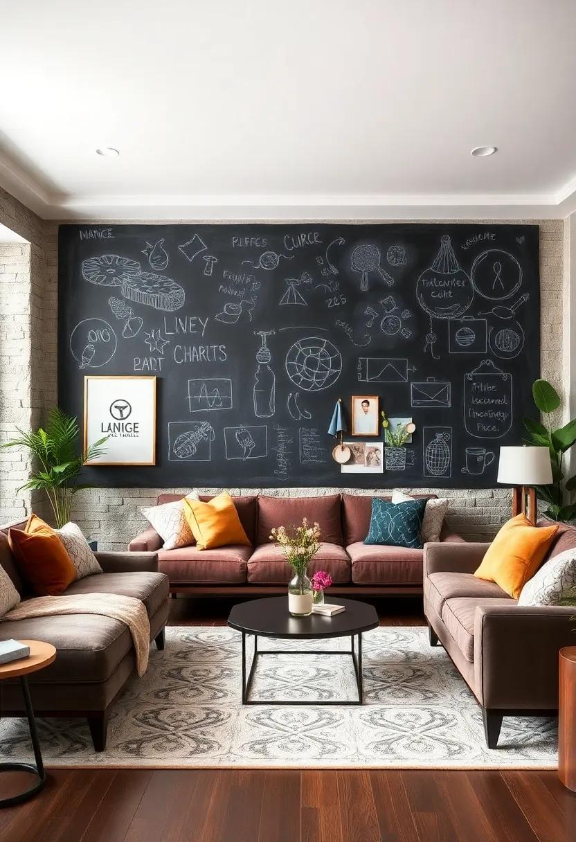 Transform a mundane wall into your personal canvas that invites creativity and spontaneity. By applying a chalkboard paint to an entire wall, you instantly create a space where ideas can flourish, and notes can be jotted down without the permanence of a pen. This interactive surface encourages daily doodles, inspirational quotes, or reminders, infusing your living room with a playful energy. Children and guests alike will love contributing their doodles, turning the wall into a lively collaborative space that evolves with your family’s or friends’ creativity.To enhance the functionality of your chalkboard wall, consider adding a few charming accessories that complement its purpose. Incorporate a stylish chalk holder and a small eraser mounted nearby for easy access. You could even create a weekly planner layout within a designated area,helping everyone keep track of critically important dates and activities. Add a table to visualize how you might organise your notes or art: