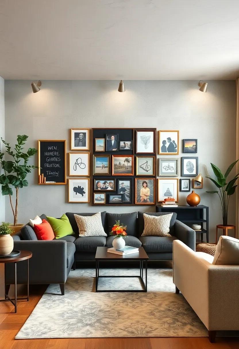 Transform your living room into a personalized gallery with a creative photo collage displayed on a framed bulletin board. Start by gathering your favorite snapshots that capture special moments—family vacations, celebrations, and candid selfies. Arrange these photos in an eye-catching layout, leaving enough space to write on the board.The beauty of using a chalkboard for the dates or events is that it allows for change; as you create new memories or want to shift focus, simply erase and write again!