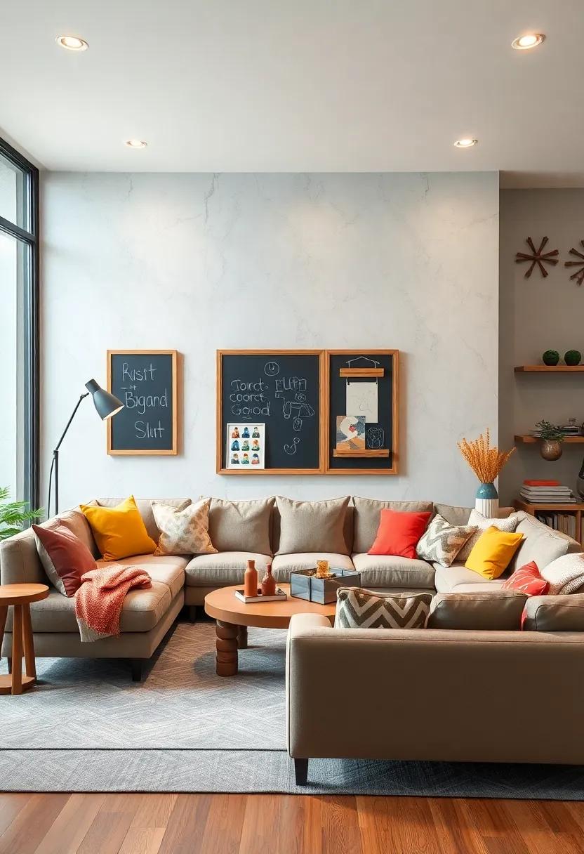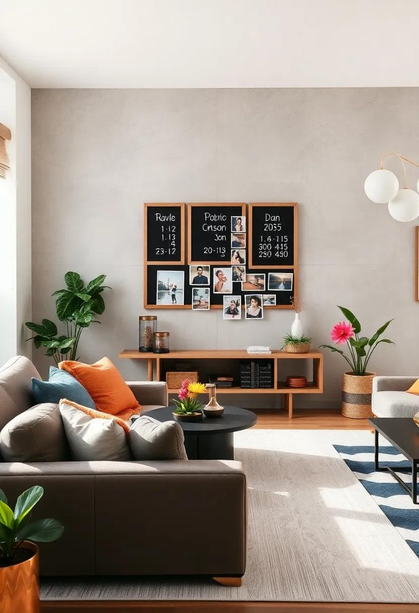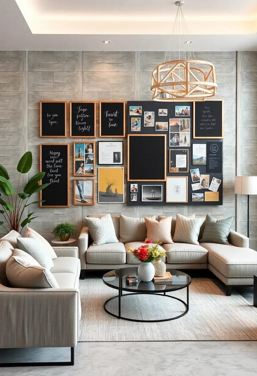 To enhance this setup creatively, consider incorporating various shapes and sizes for your boards. Use circular chalkboards paired with rectangular bulletin boards, or even create a staggered layout for visual interest. Frame the boards with interesting materials, such as reclaimed wood or colorful washi tape, to add personality. Designate specific sections for different themes—like holidays, milestones, or daily inspirations—ensuring that every member of the family can add their touch. This dynamic display not only brightens your living room but also serves as a cherished collection of shared experiences.
