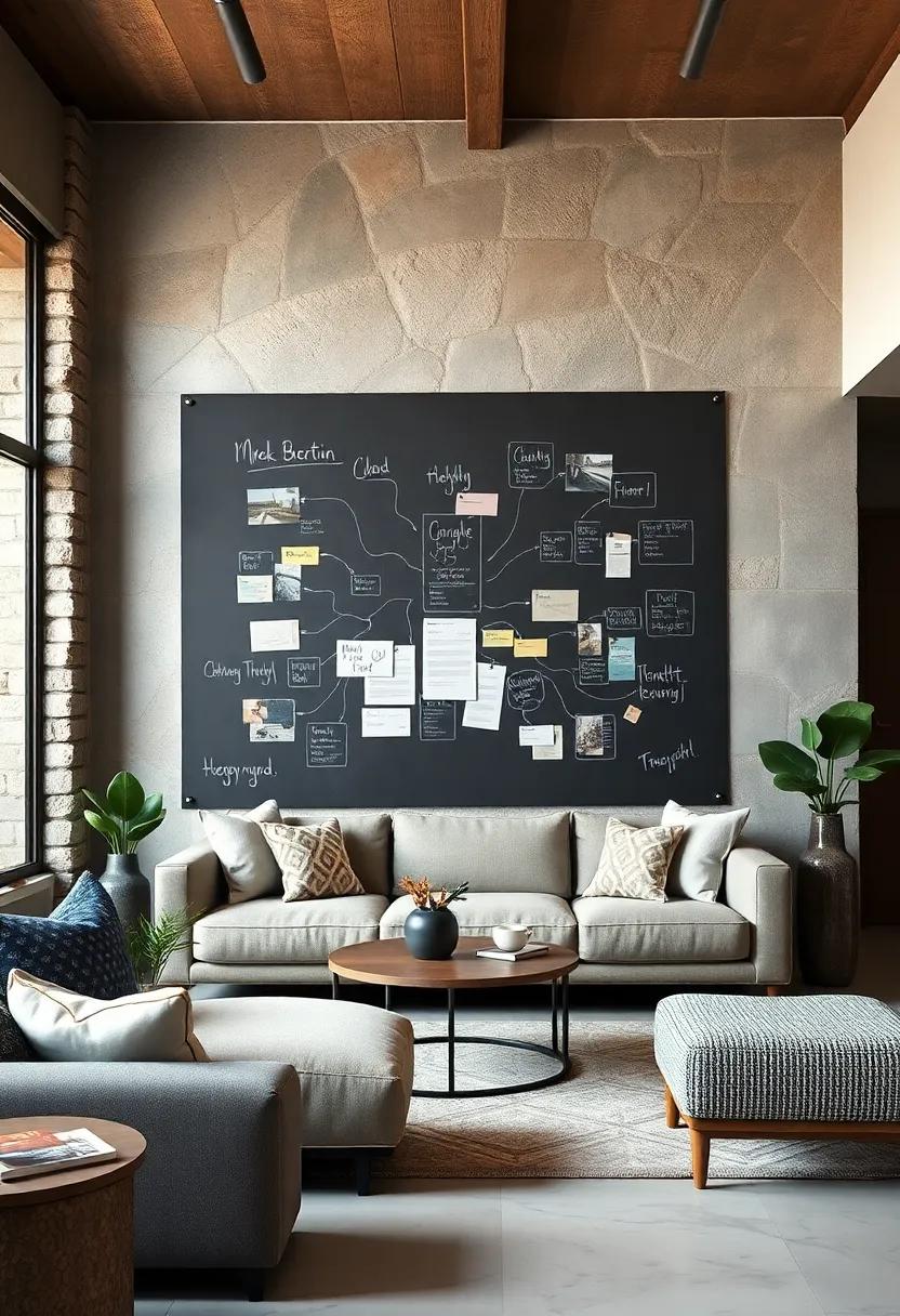 Consider dedicating sections of the chalkboard for different projects or themes, such as home renovations, holiday planning, or even personal growth goals. You might even implement a system of color coding to differentiate ideas or priorities for a more organized approach. As your ideas evolve, so will your chalkboard, allowing it to reflect your personality and interests. Layering your thoughts visually not only enhances memory retention but also sparks ongoing creativity in your living room space.