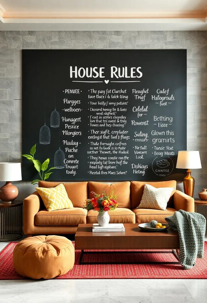Transform a blank wall in your living room into a vibrant canvas of expression by installing a large chalkboard. This versatile piece of decor can serve as the heart of family unity, proudly displaying your household’s cherished values and rules.use bright, colorful chalk to make the rules stand out, and consider adding illustrations or doodles that reflect your family’s personality. Not only does this display promote a sense of order, but it also opens the door for family conversations and ongoing updates, keeping everyone engaged in a collaborative effort to maintain harmony.