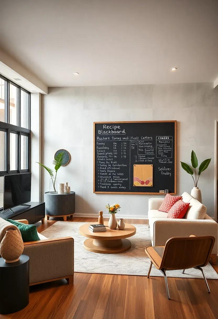 But the fun doesn’t stop there! Use your chalkboard to display favorite recipes that you can change out weekly, ensuring you keep things fresh and engaging. Consider drawing a simple table that showcases ingredients and cooking times to help you visualize each dish. You might even create a special section for family recipes to pass down through generations. Guests will appreciate the personal touch when they see the chalkboard filled with your beloved dishes and new culinary adventures as they gather in your inviting living room space.