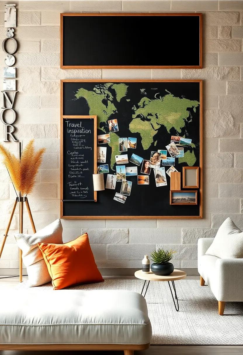 Create a vibrant travel inspiration board in your living room by pinning postcards and travel memorabilia that spark nostalgia. Start by choosing a dedicated bulletin board or design a customizable section of your chalkboard wall. Here, you can showcase scenic postcards from beloved destinations, unique stamps collected from various travels, and maps that outline your journeys. Mix in memorable tickets and snapshots, creating a visual tapestry of your adventures. each photo and card will serve as a tangible reminder of past experiences, igniting a sense of wanderlust every time you walk by.
