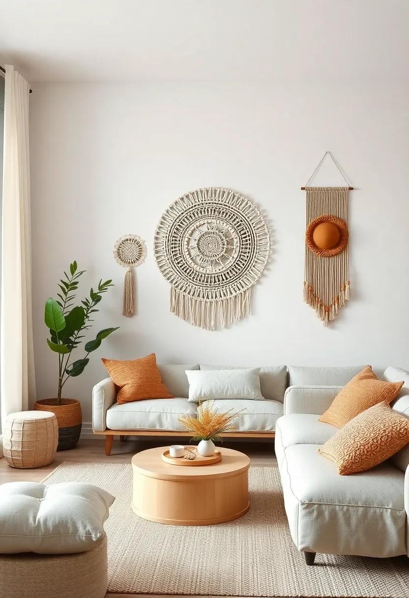 | Macramé Hangings | Intricately knotted designs that provide depth. | Warm whites, beige, soft browns |