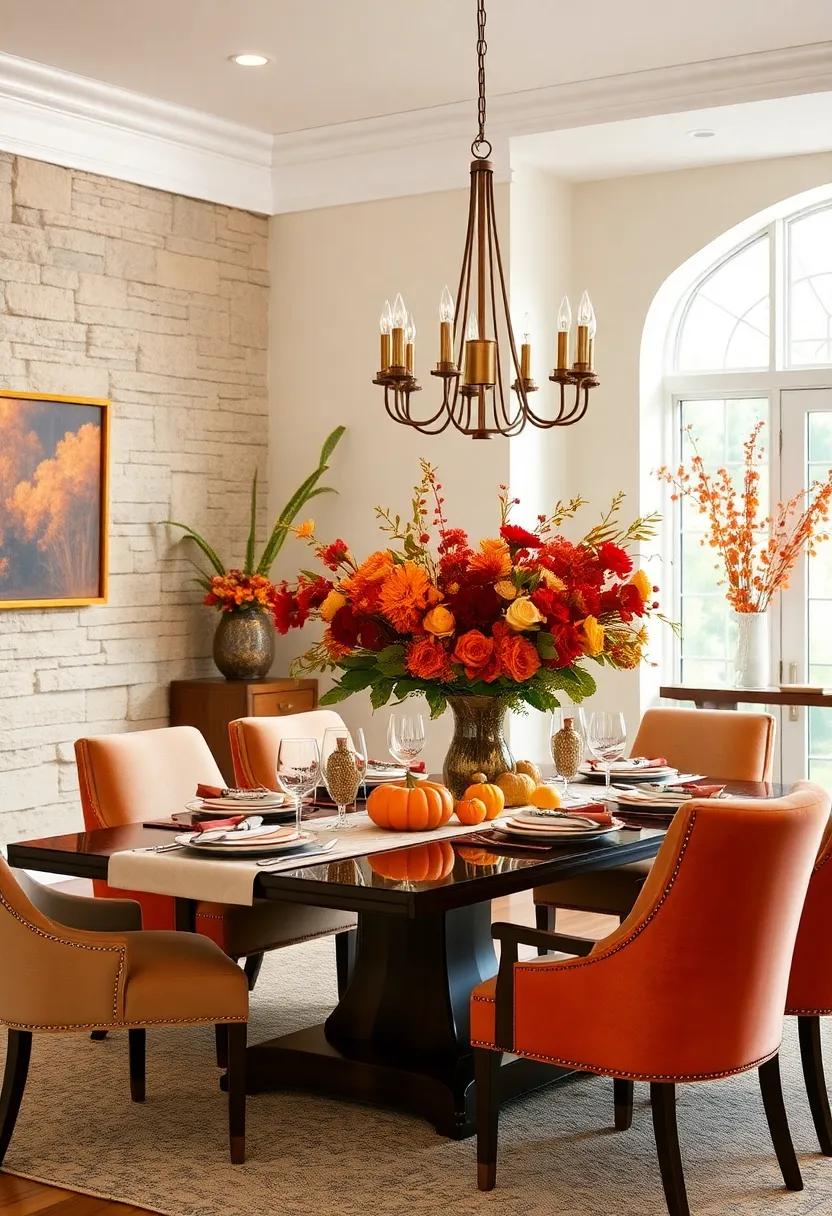 Floral Arrangements: Choose rich, fall-inspired floral arrangements with deep reds, oranges, and yellows to bring a vibrant touch to your dining space