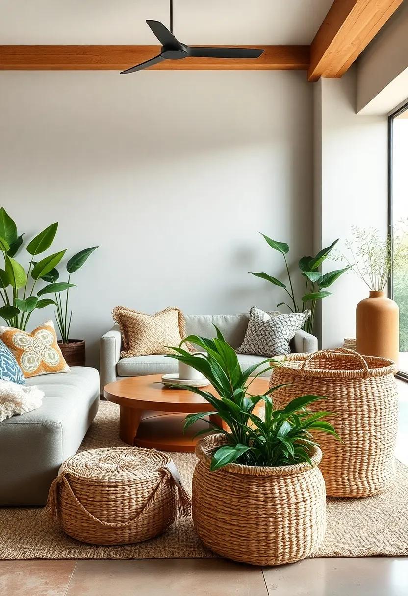 Seagrass Baskets: Utilize woven seagrass baskets for storage solutions that bring texture into your home while being kind to the environment