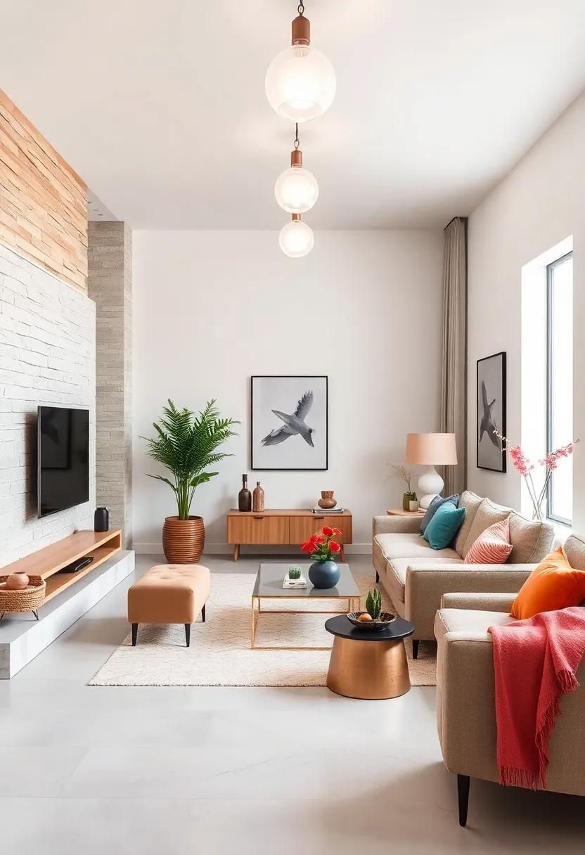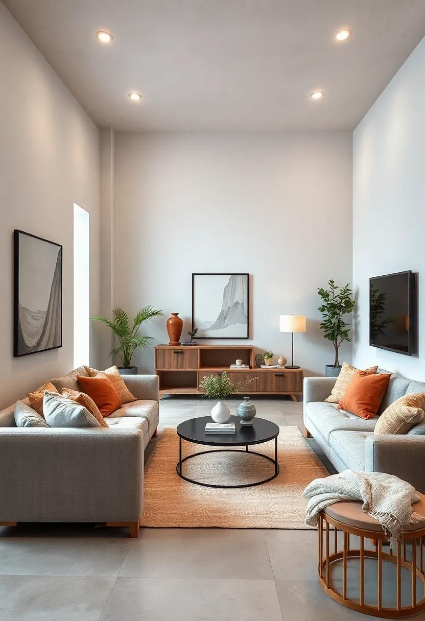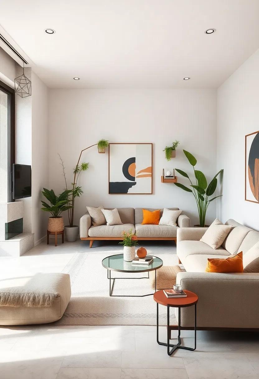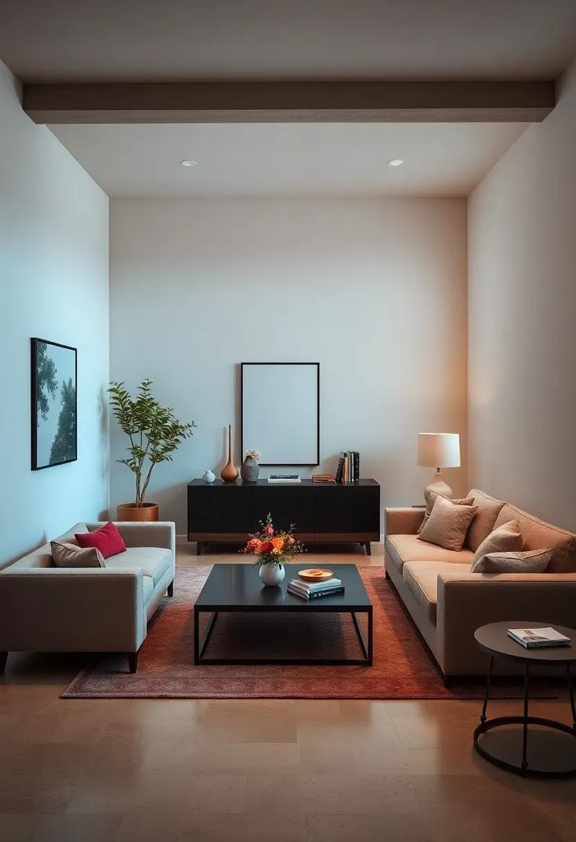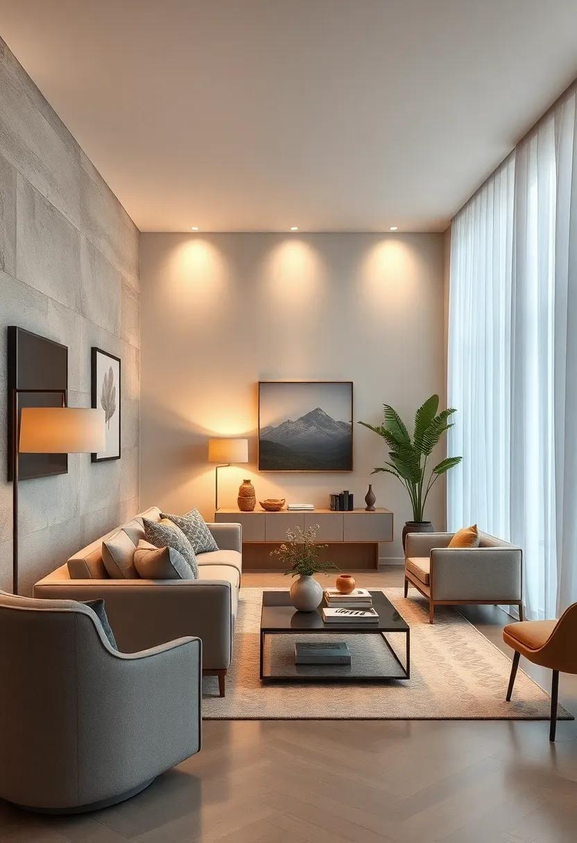 When selecting table and floor lamps, aim for those with simple, geometric shapes. Adjustable LED lamps can offer versatility in brightness, allowing you to tailor the lighting to different activities. Incorporate light fixtures with a brushed metal finish or a matte surface to complement your minimalistic aesthetic. Additionally, using invisible mounting techniques—like recessed lighting—ensures a polished look. Focusing on functionality and form will transform your living room into a tranquil oasis without any visual clutter.