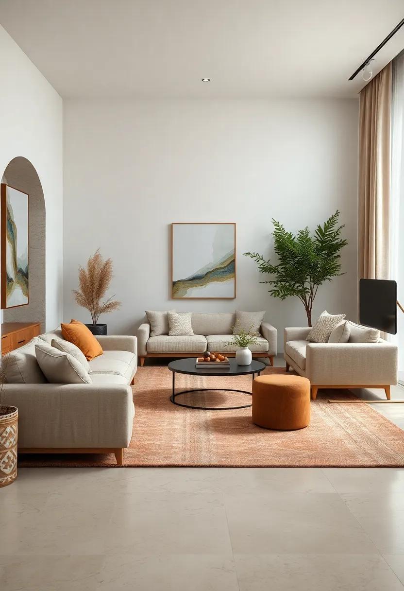 Create a sense of tranquility by incorporating natural elements and soft textures. Use area rugs to define spaces while simultaneously leading the eye from one section to another. Choose colors in serene neutral tones to promote relaxation; a soft beige couch paired with muted green pillows can evoke a peaceful ambiance. Ensure that your decor elements, such as plants or decorative prints, are harmoniously dispersed throughout the room.This subtle balance not only enhances the overall look but also encourages a flow that makes the entire space feel cohesive and inviting.