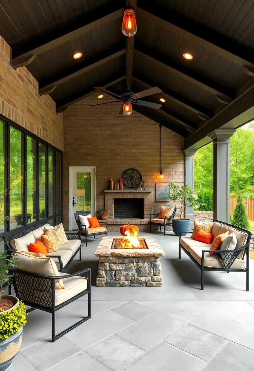 Industrial Edge: Combine metal furniture with a rustic fire pit for a striking contrast, enhanced by exposed beams and Edison bulb lighting for an urban edge