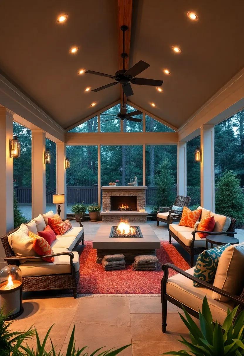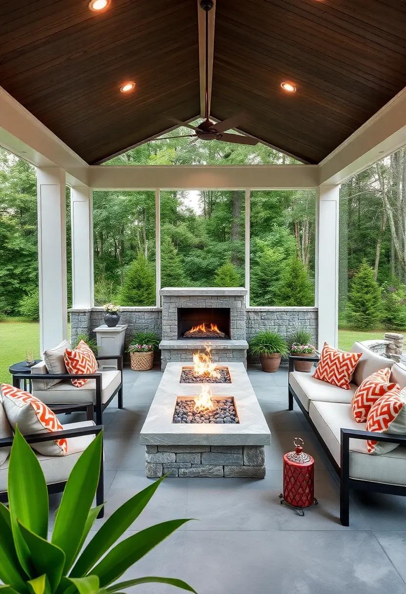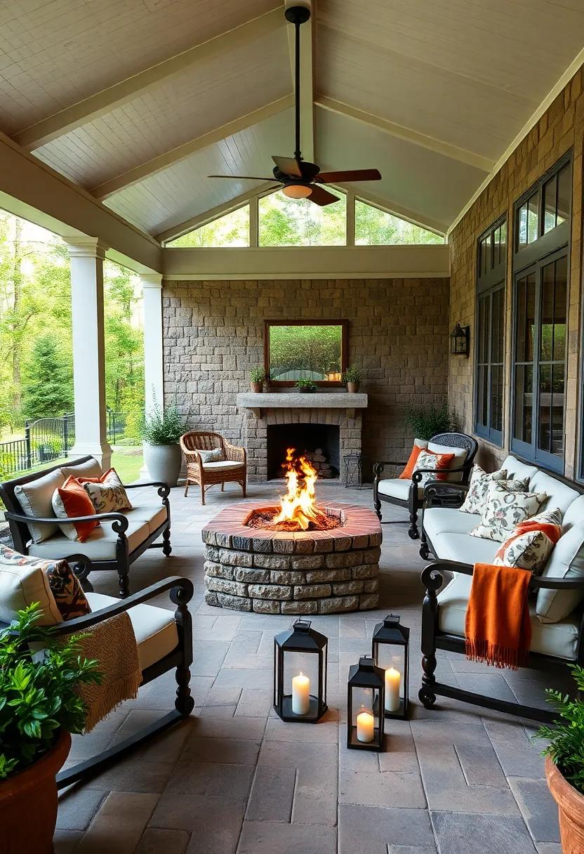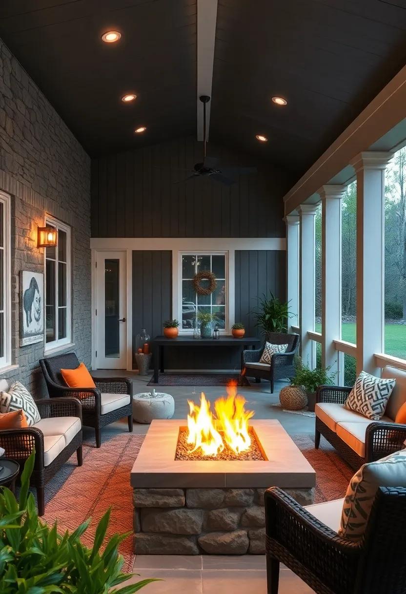 Elegant escape: Feature a covered porch with plush seating, ambient lighting, and a sophisticated fire pit that becomes the focal point of evening entertainment
