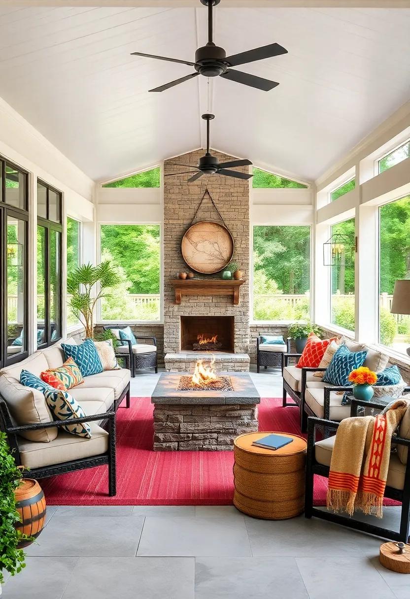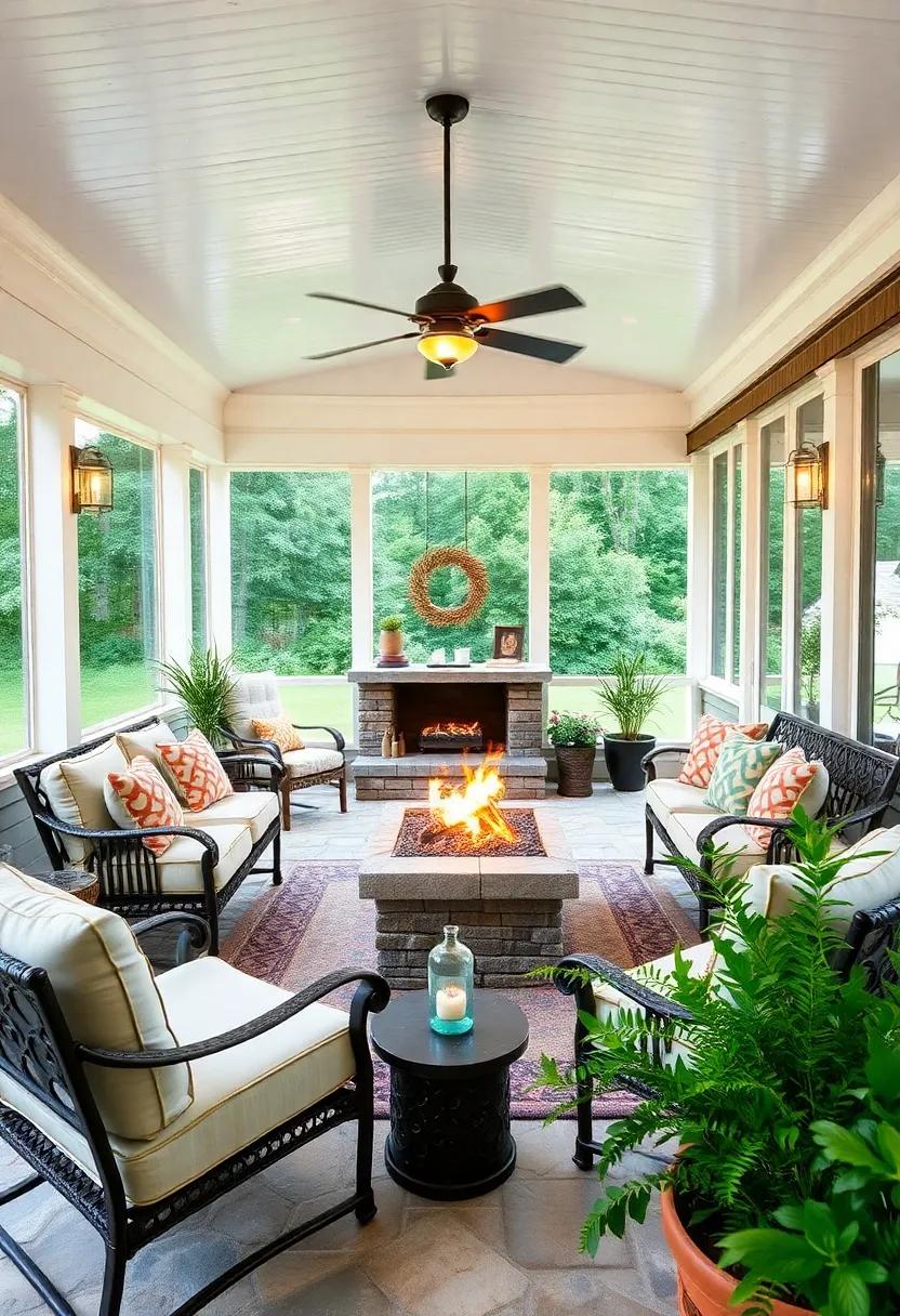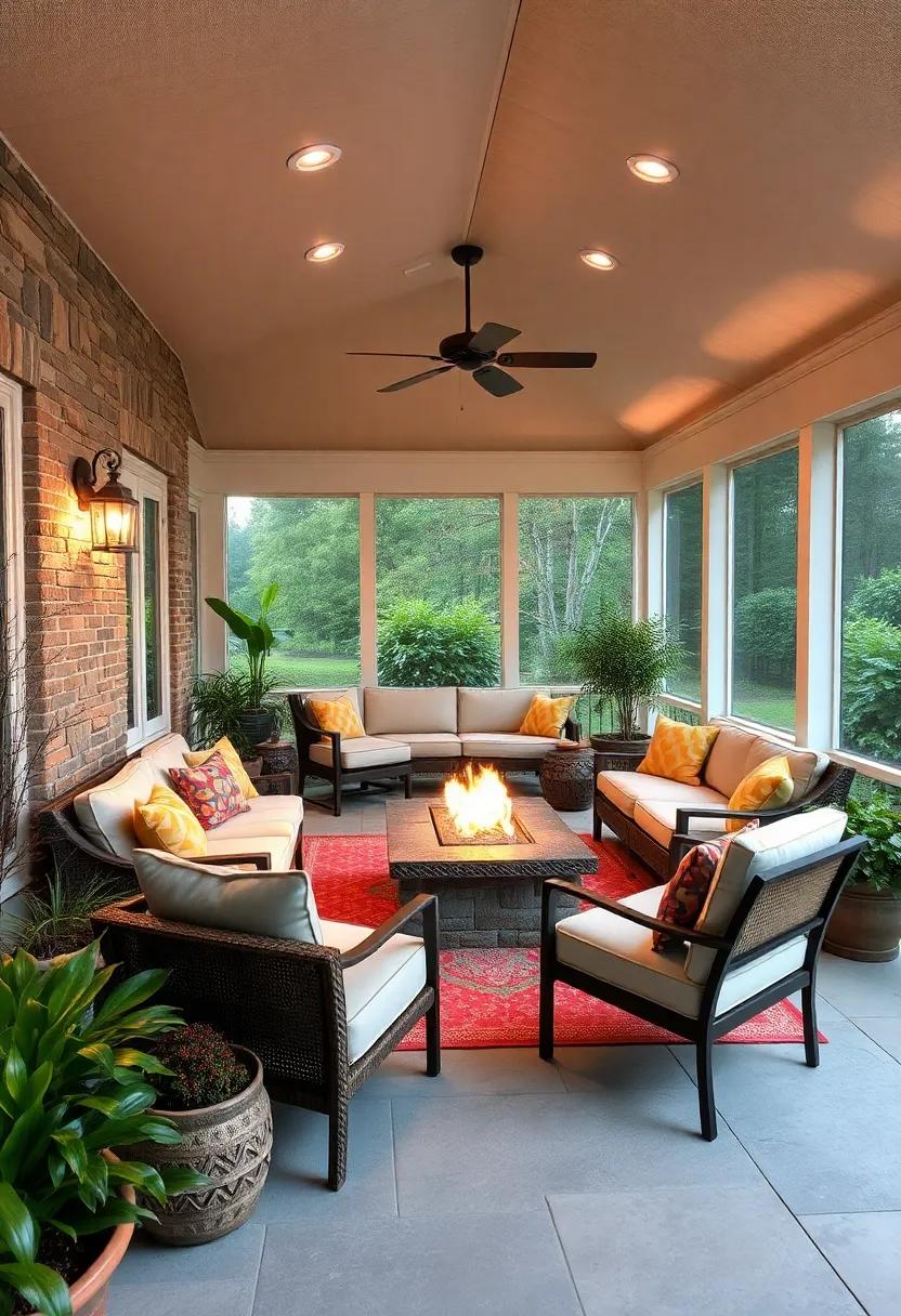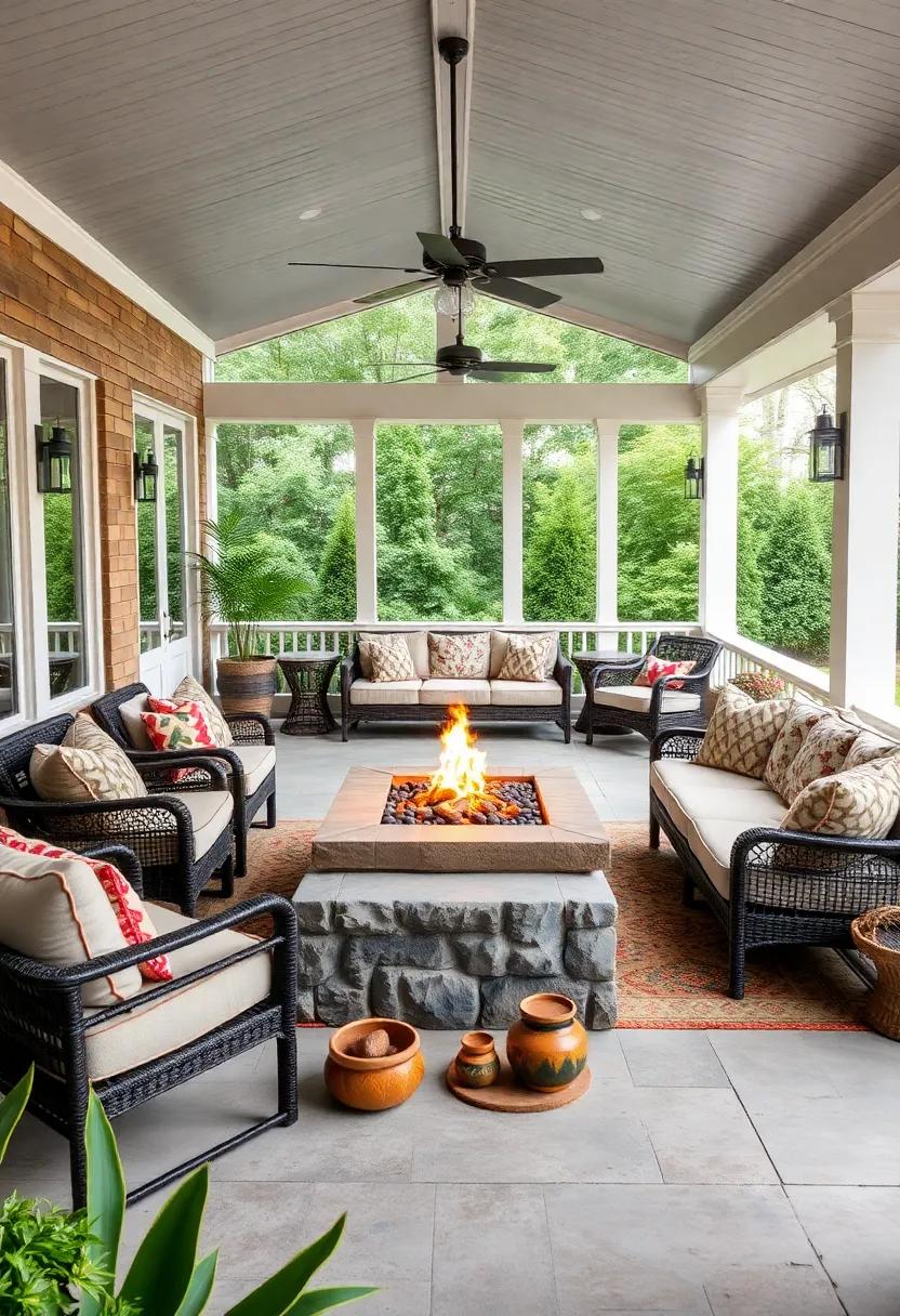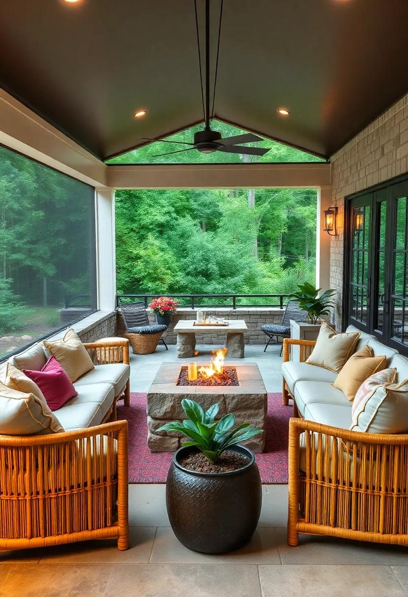 Transform your screened porch into a Bohemian haven, where earthy textiles mingle with an assortment of eclectic furniture to inspire creativity and warmth. Consider a variety of layered fabrics such as throws and pillows in rich, earthy tones—think terracotta, deep greens, and warm browns. Mix and match patterns for a fun, carefree vibe, and don’t shy away from incorporating plush poufs and rattan chairs that invite relaxation.The fire pit, the centerpiece of this inviting space, can be surrounded by vibrant ceramics that catch the eye, with each piece telling its own story, like handmade pottery and colorful tiles that accentuate the beauty of the natural elements around them.