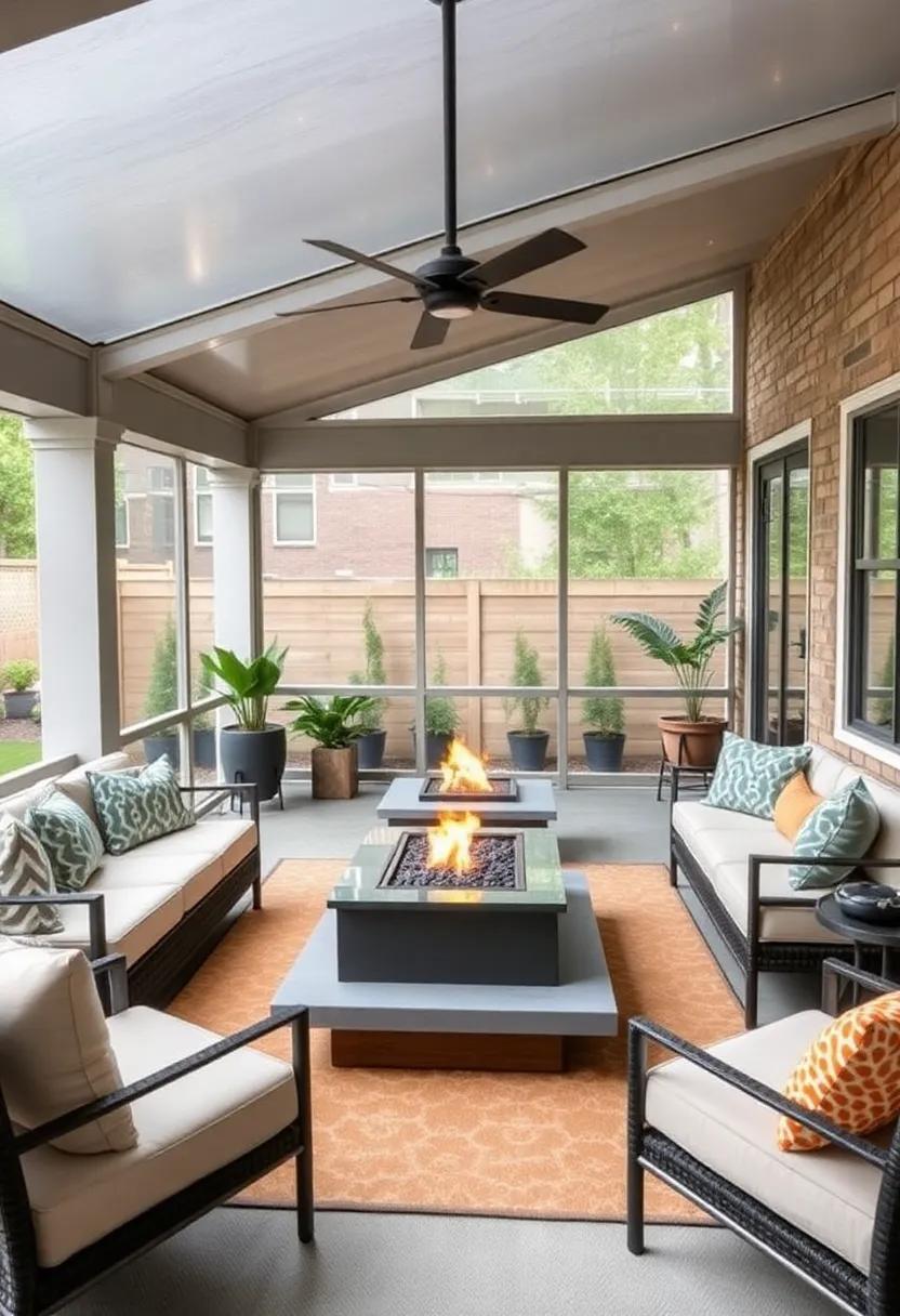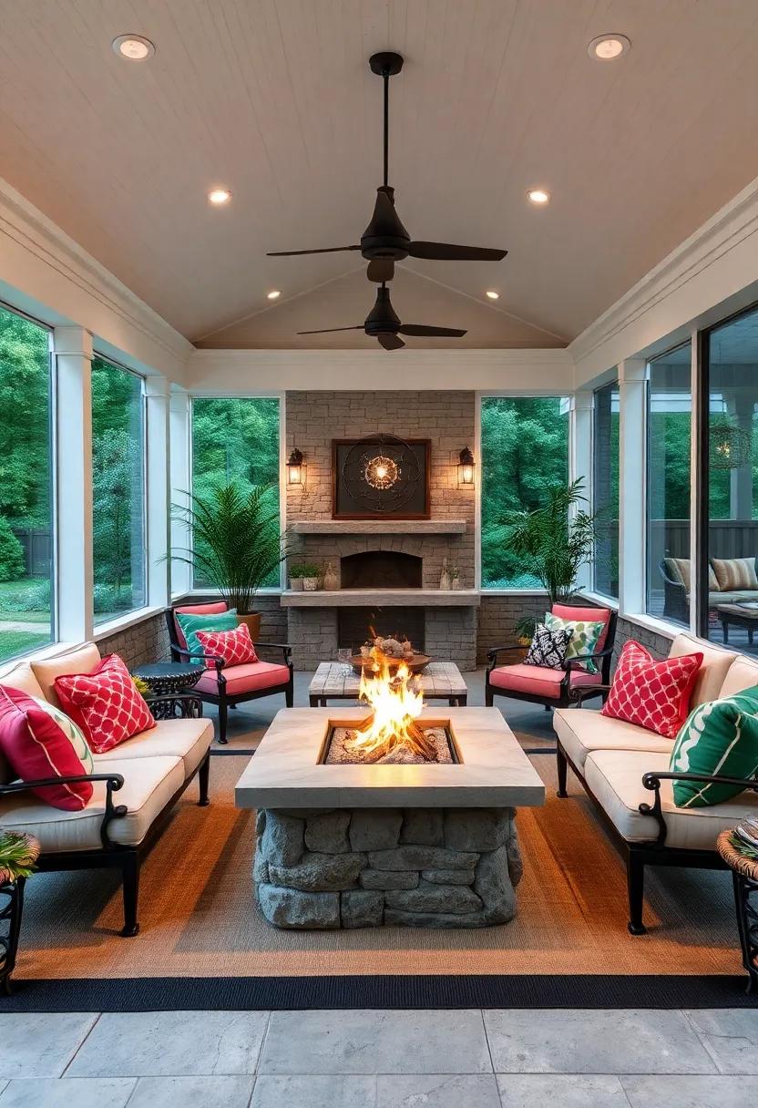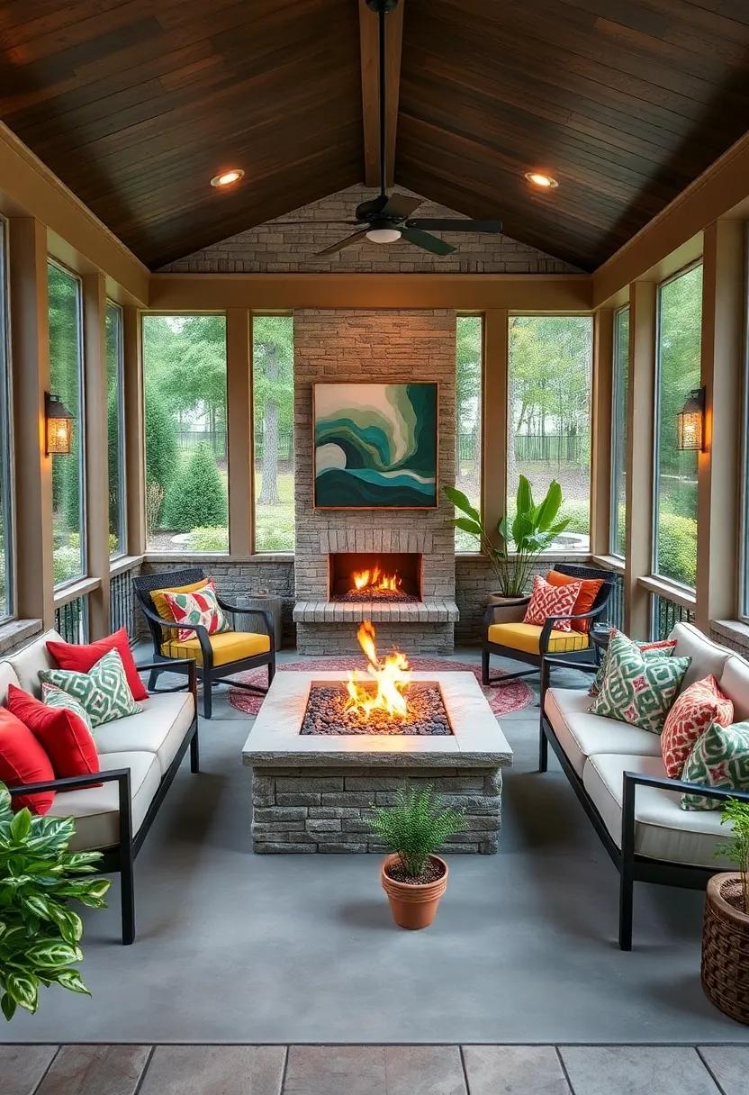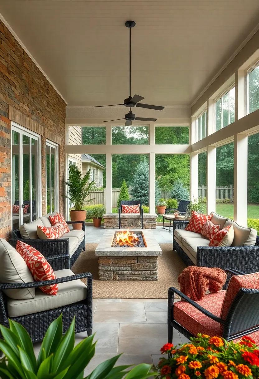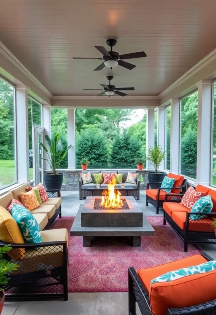 Transform your screened porch into a vibrant oasis by incorporating a mix of bright colors and lively patterns in your seating arrangements. Consider plush cushions adorned with bold geometric prints or floral designs that draw the eye and invite relaxation. Pair these colorful accents with a modern fire pit at the center, serving as a stunning focal point that harmonizes the entire space. Choose seating options like cozy lounge chairs or a sectional sofa in cheerful hues, and don’t hesitate to layer in throw blankets that add depth and warmth to the overall aesthetic.